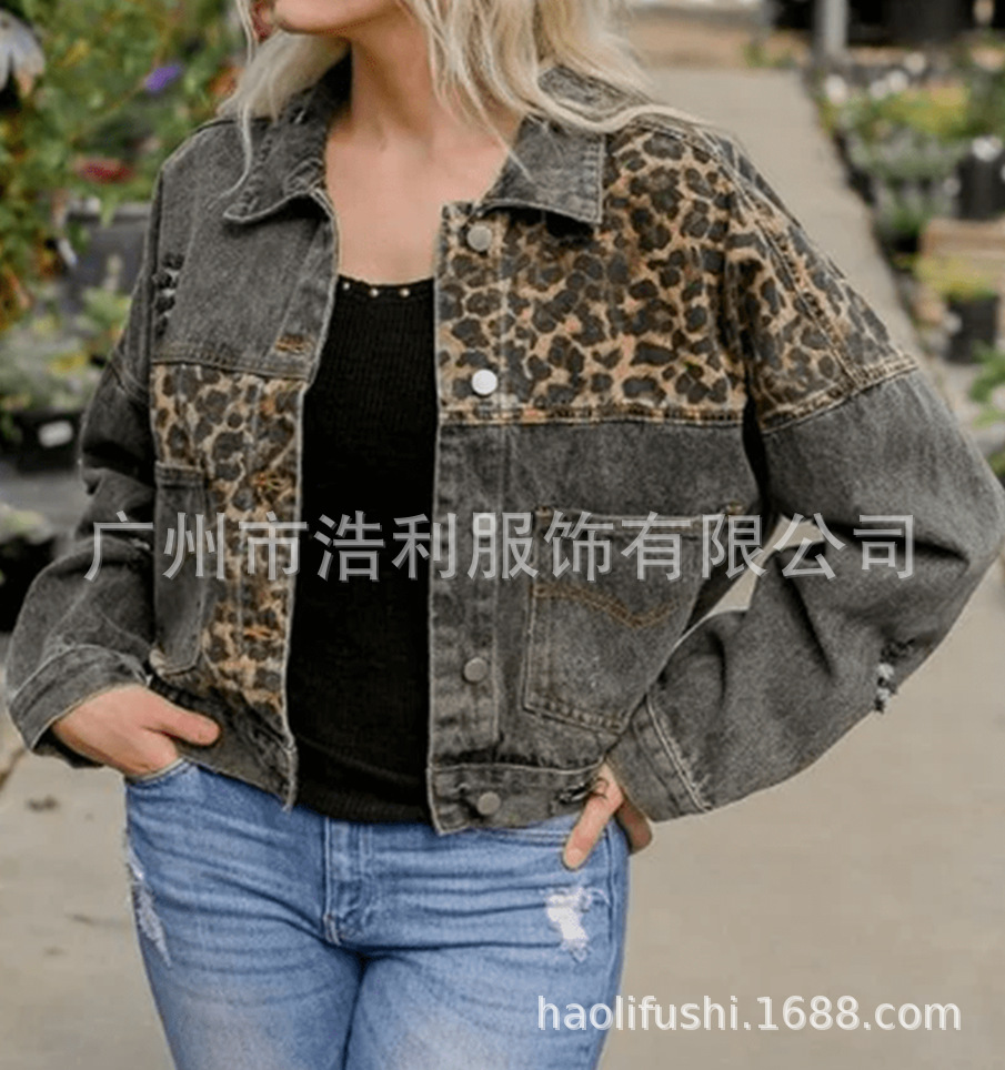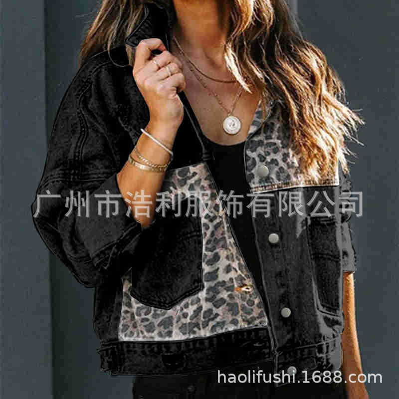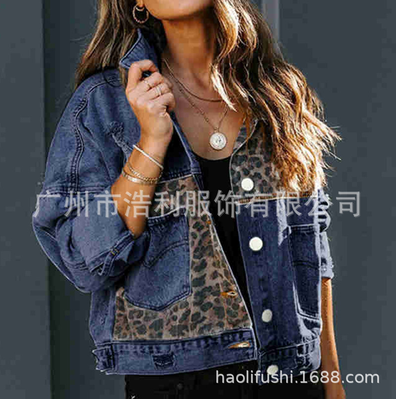 크로스 국경 가을과 겨울 아마존 데님 코트 여자의 긴 소매 독립 역 유럽과 미국 데님 재킷 코트 여자의 표범 바느질
