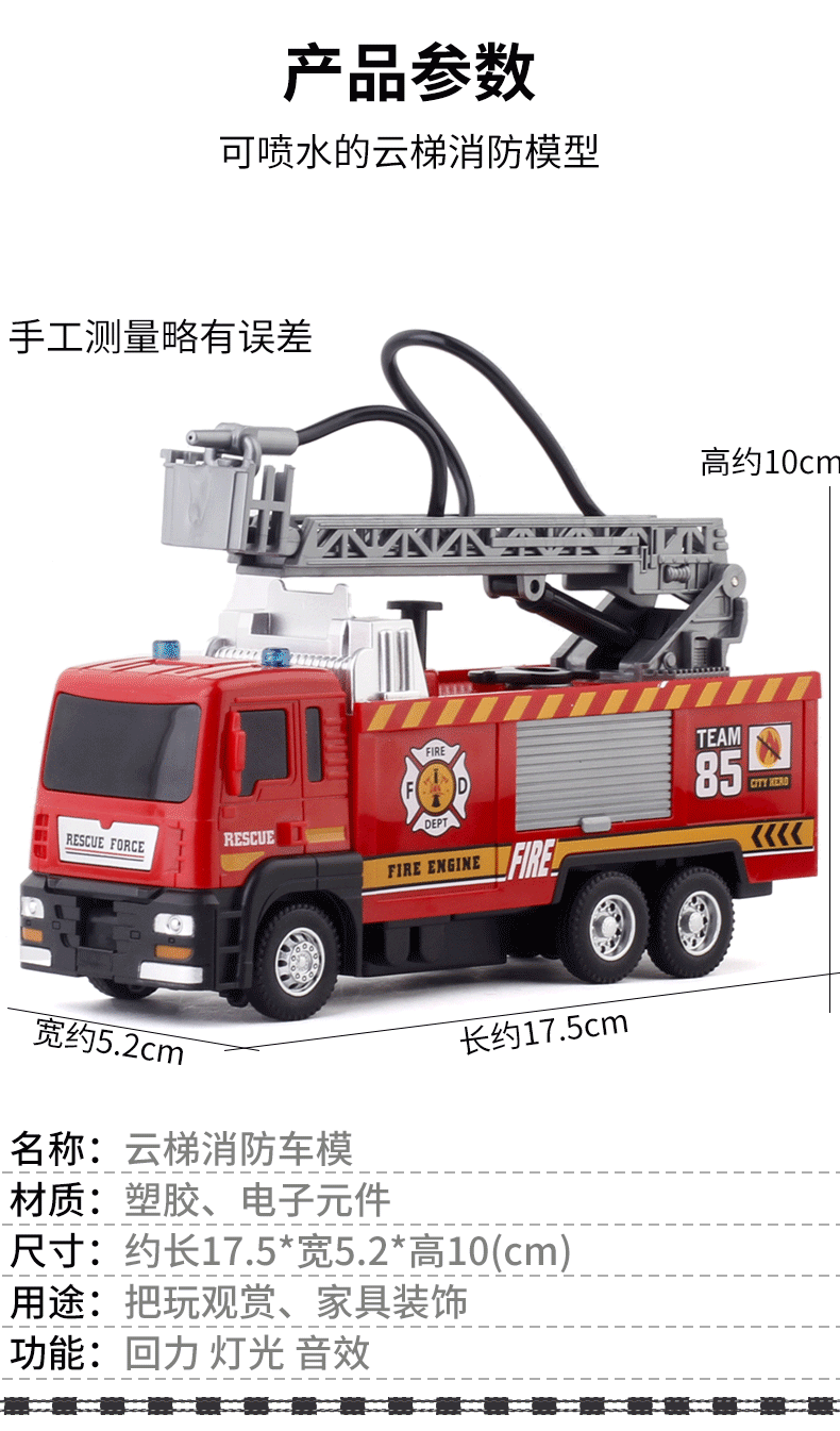 Tianying은 물 합금 시뮬레이션 사다리 물 탱크 소방차가 물 소리와 빛을 다시 토이 자동차 모델을 강제 할 수 있습니다