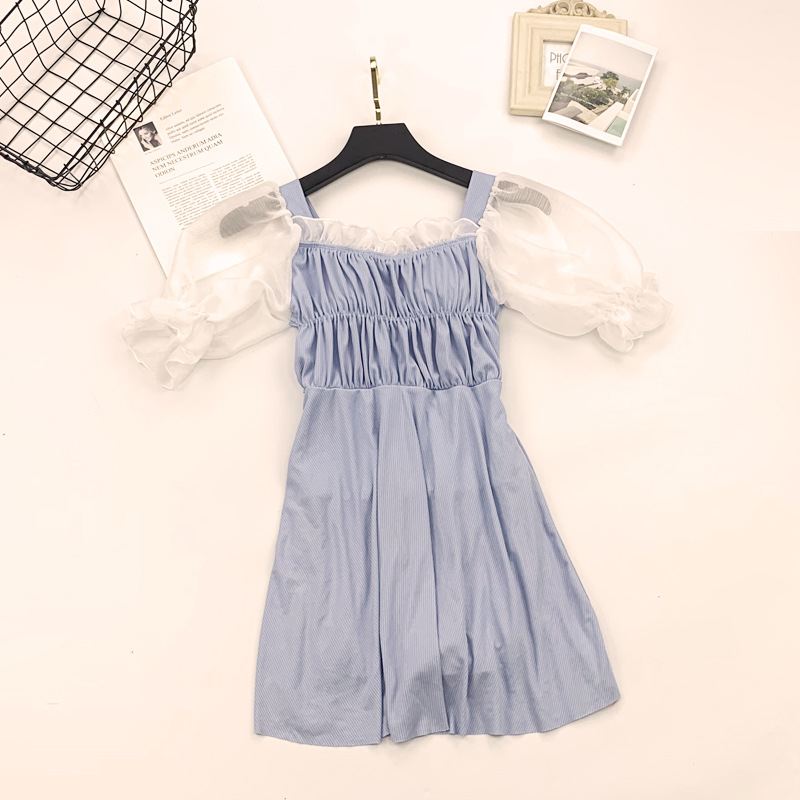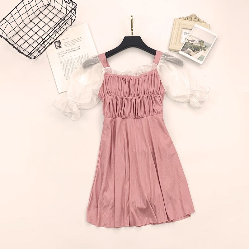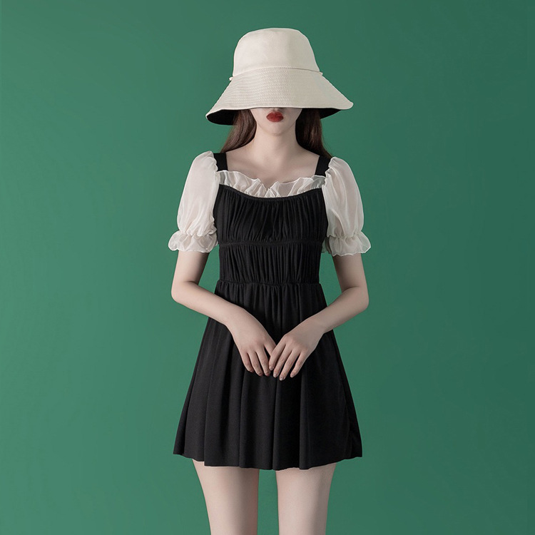 페어리 스타일 수영복 여성용 작은 가슴 푸시 업 원피스 스커트 하이 웨이스트 슬리밍 배꼽 커버 소매 복서와 작은 신선한 수영복스토어 가기