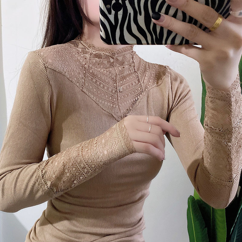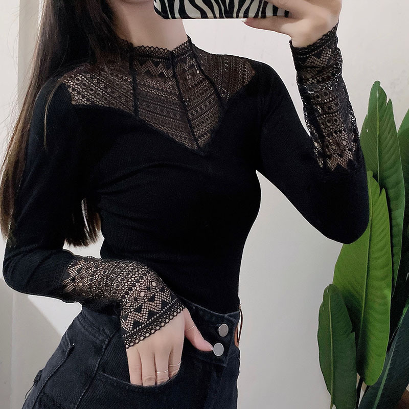 2021 레이스 세미 하이 칼라 풀오버 실 코튼 허리 퓨어 컬러 신선한 스위트 블랙 유럽 및 미국 슬림핏 베이스 셔츠스토어 가기