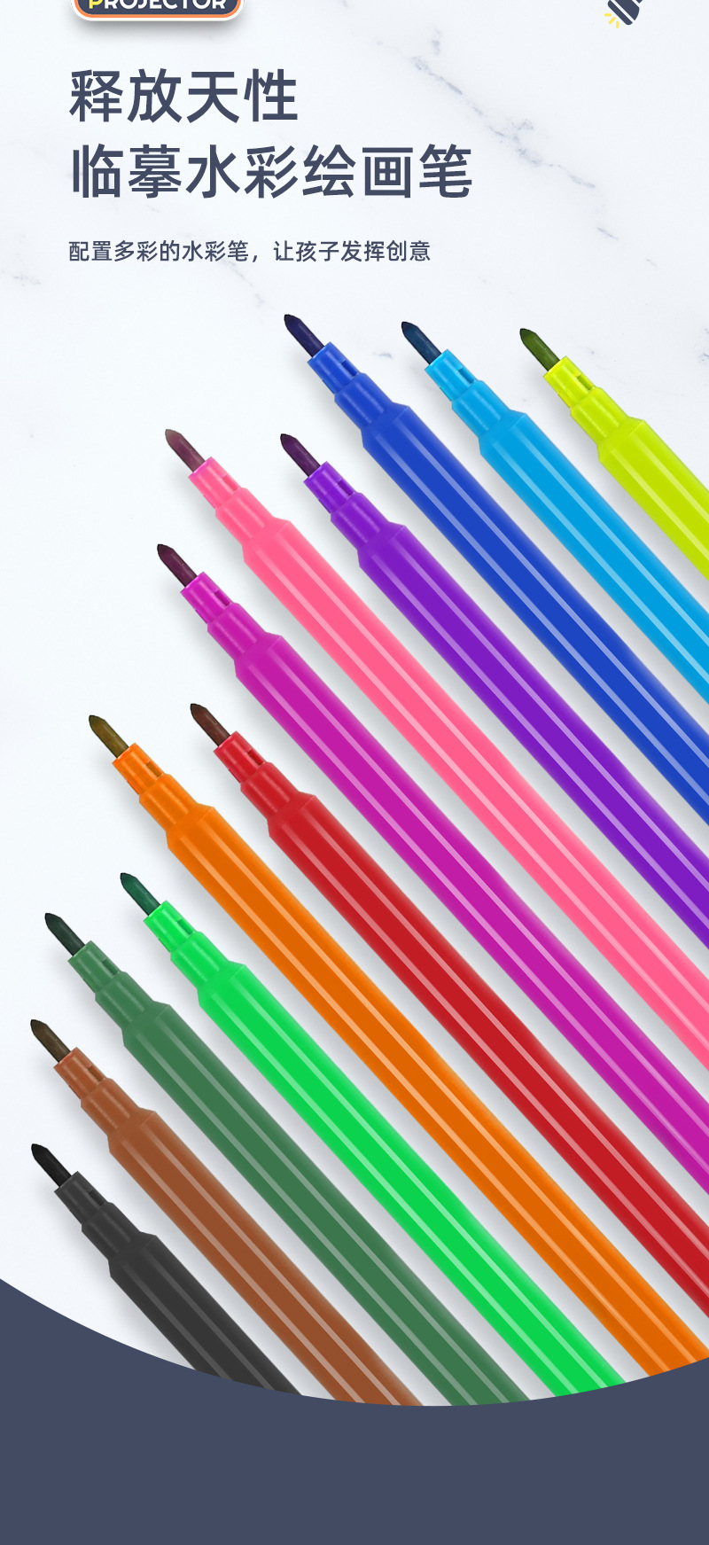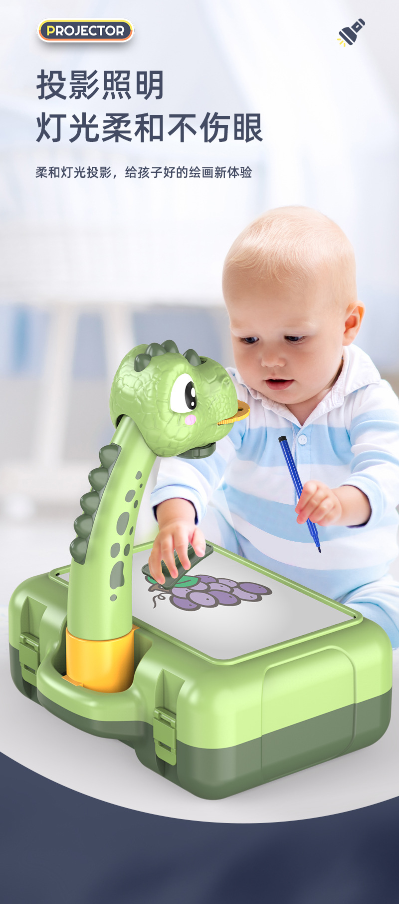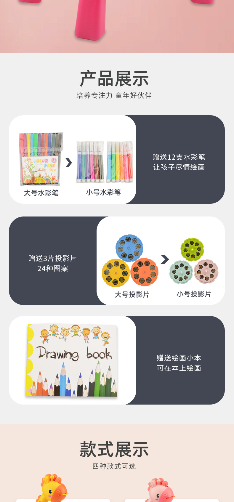配置:水彩笔*12支、幻灯片*3个/24种图案任选、画本*1、画板擦*1【带灯光、音效】
