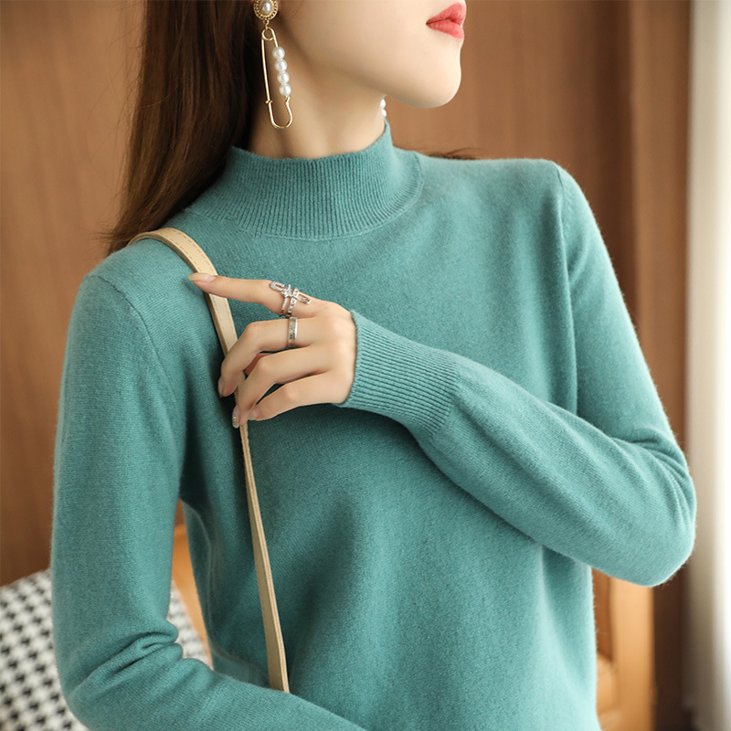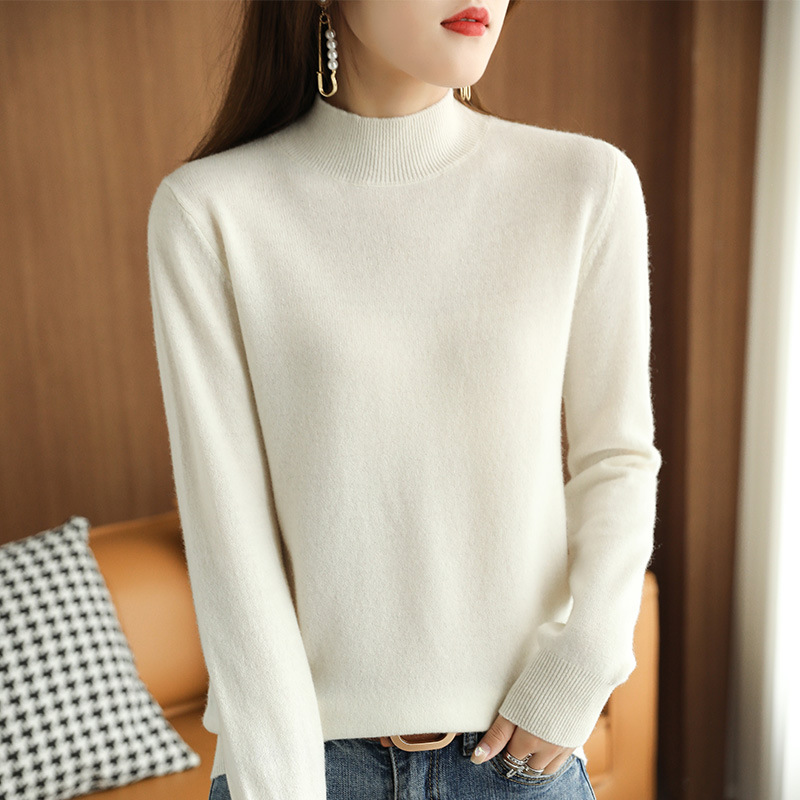 2021 가을 신상품 스웨터 여성용 루즈한 하프 터틀넥 스웨터 미드넥 탑 퓨어 화이트 이너베이스 셔츠