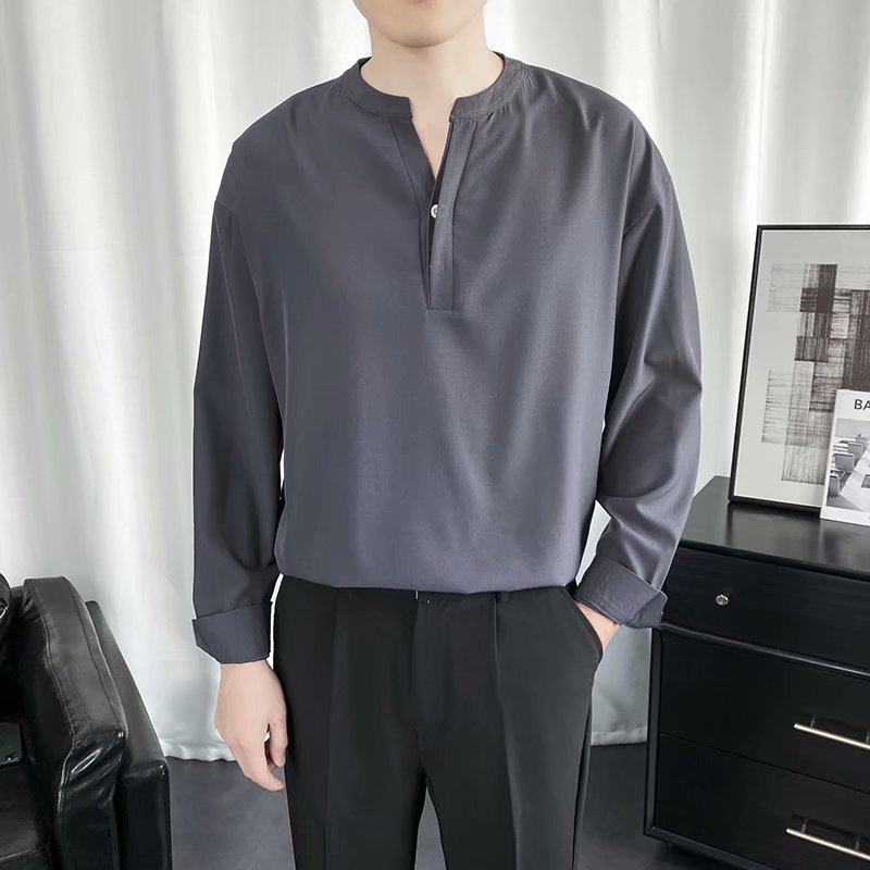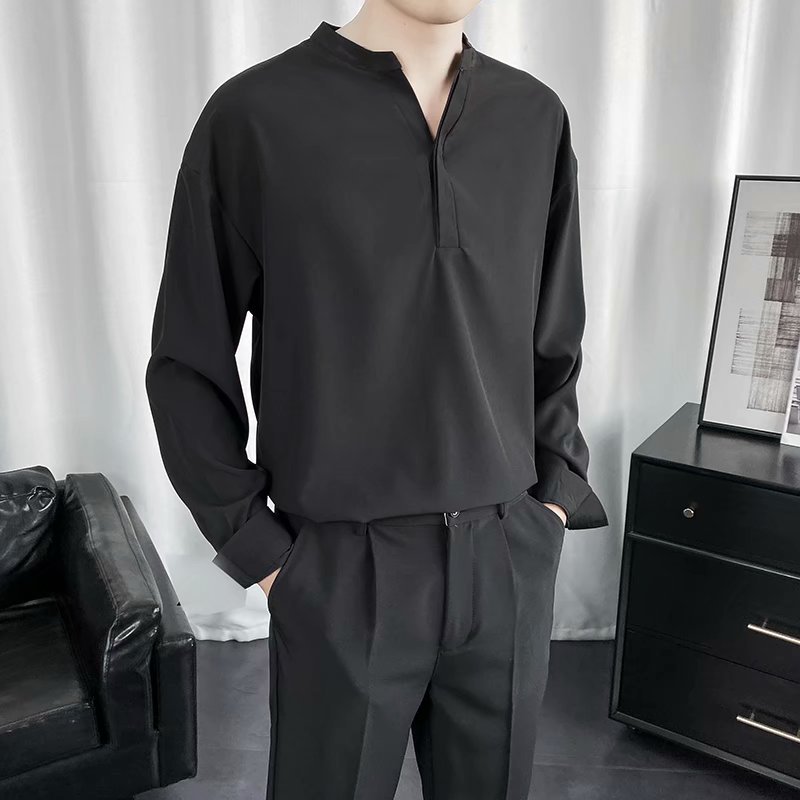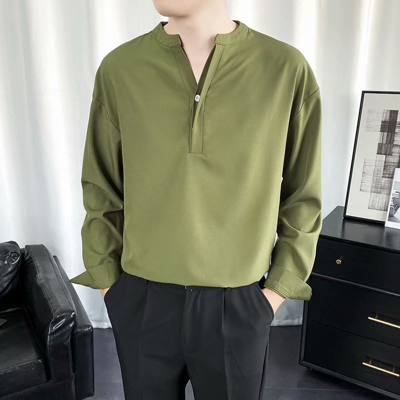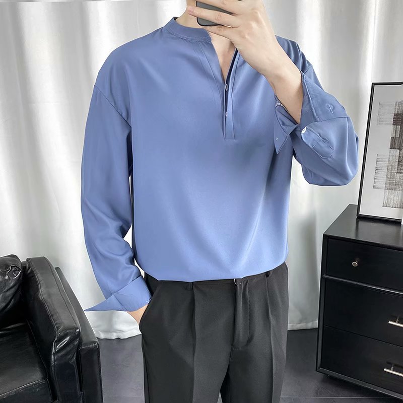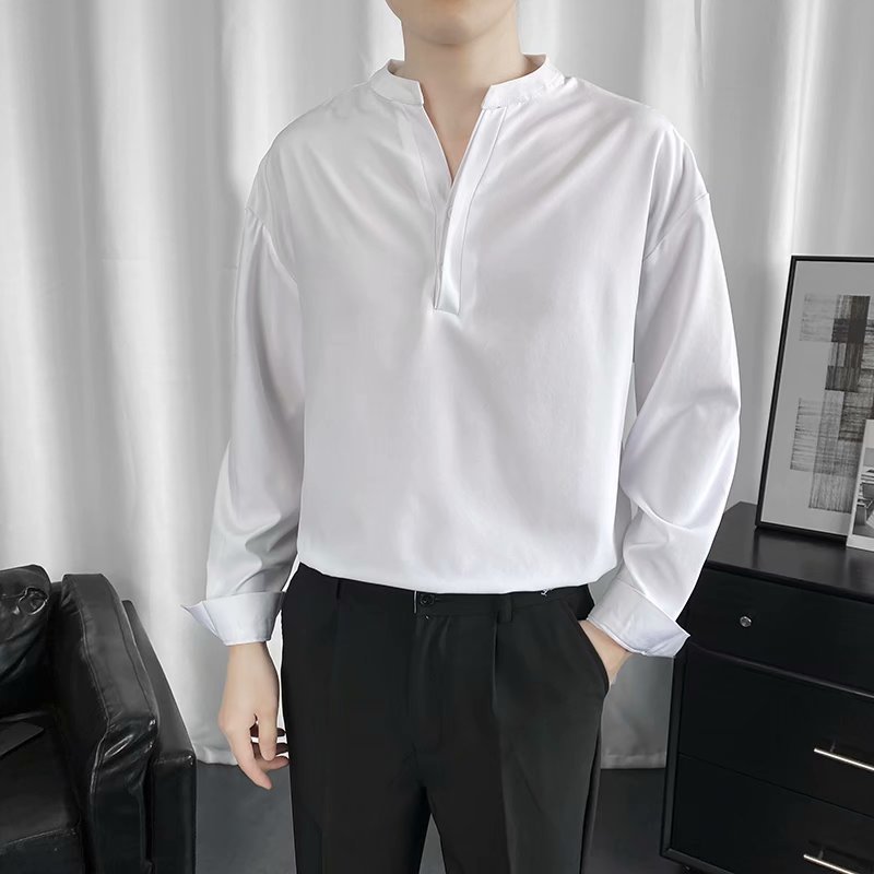 드레이핑 셔츠 남성용 긴팔 봄 한국식 유행 느슨한 세트 칼라 풀오버 셔츠 Ruffian Handsome 남성용 모든 매치 탑스토어 가기