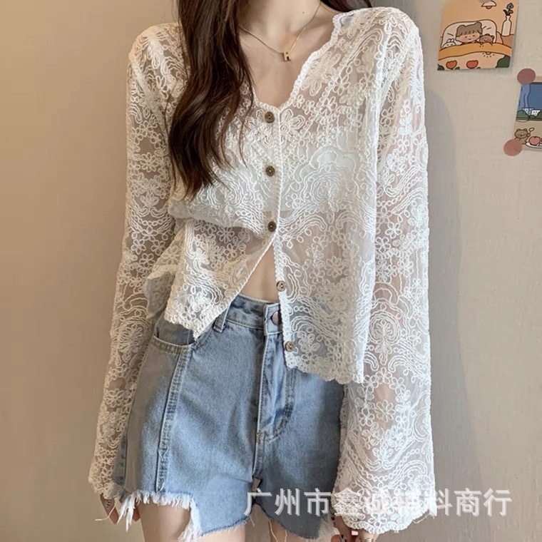 가을 한국 슈퍼 요정 크로 셰 뜨개질 레이스 화이트 셔츠 여자의 얇은 디자인 감각 틈새 대학 스타일 중공 셔츠 작은 셔츠스토어 가기