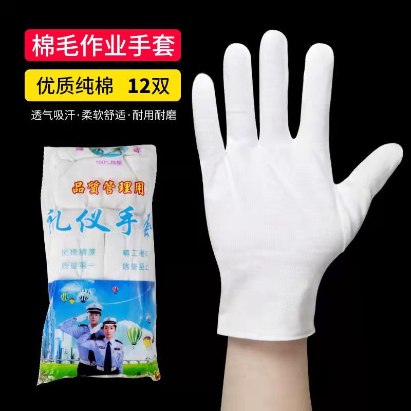 흰 장갑 에티켓 순면 텍스트 플레이 플레이트 비드 조작 노동 보호 운전 얇은 땀 천 두꺼운 내마모성 작업 품질 검사 남성스토어 가기