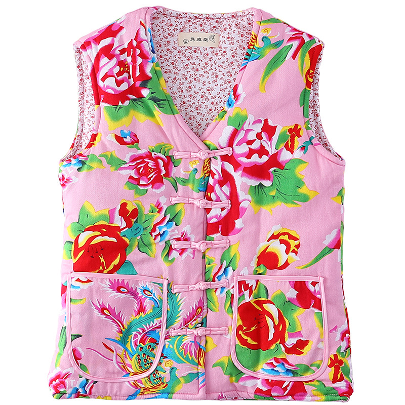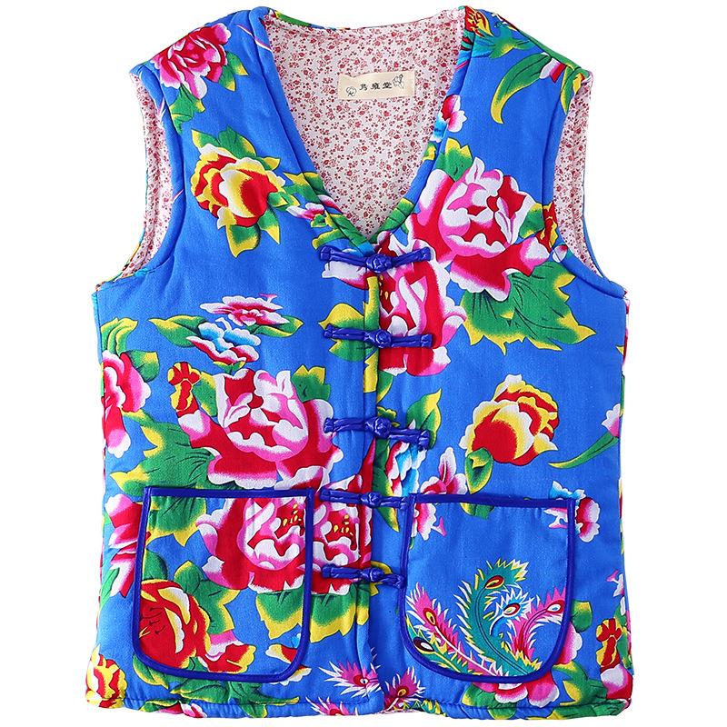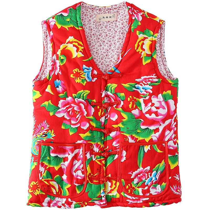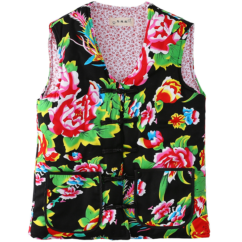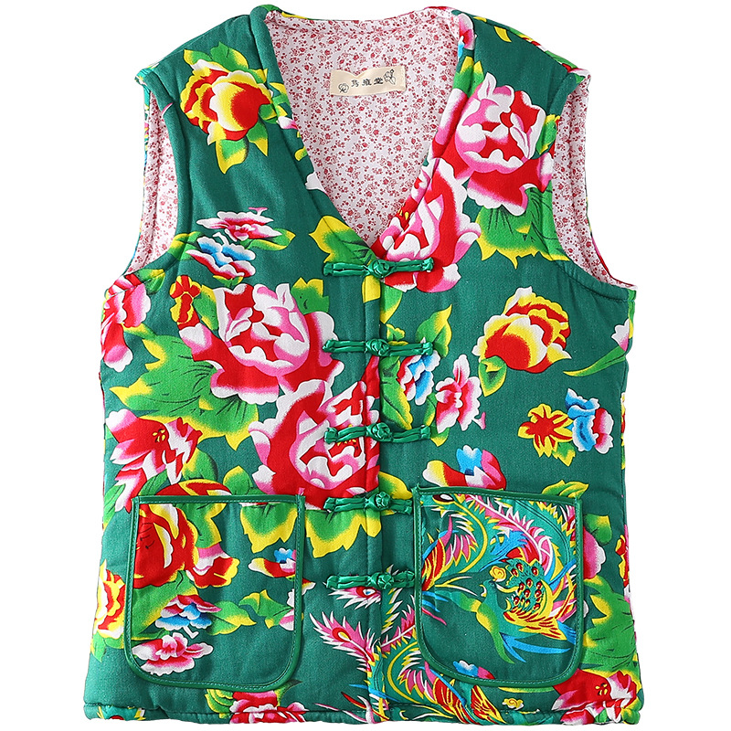 동북 꽃 천 실크 면 조끼 여성용 가을과 겨울 두꺼운 따뜻한 조끼 에스닉 스타일의 성인용 슬림핏 코튼 패딩 재킷