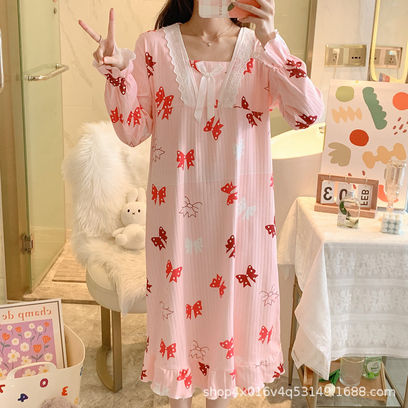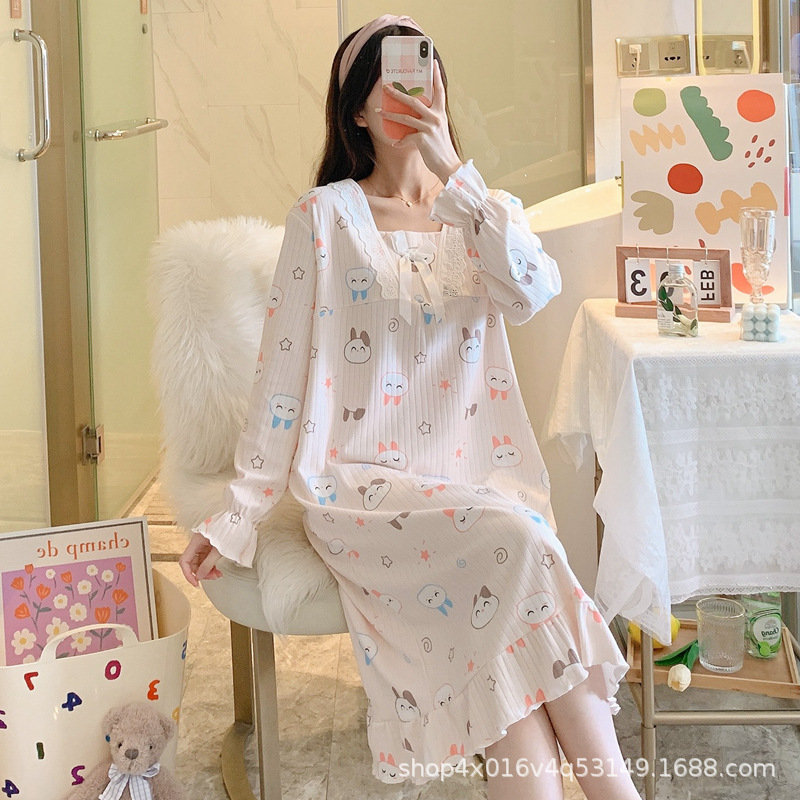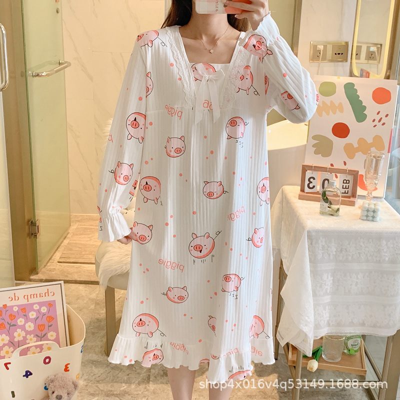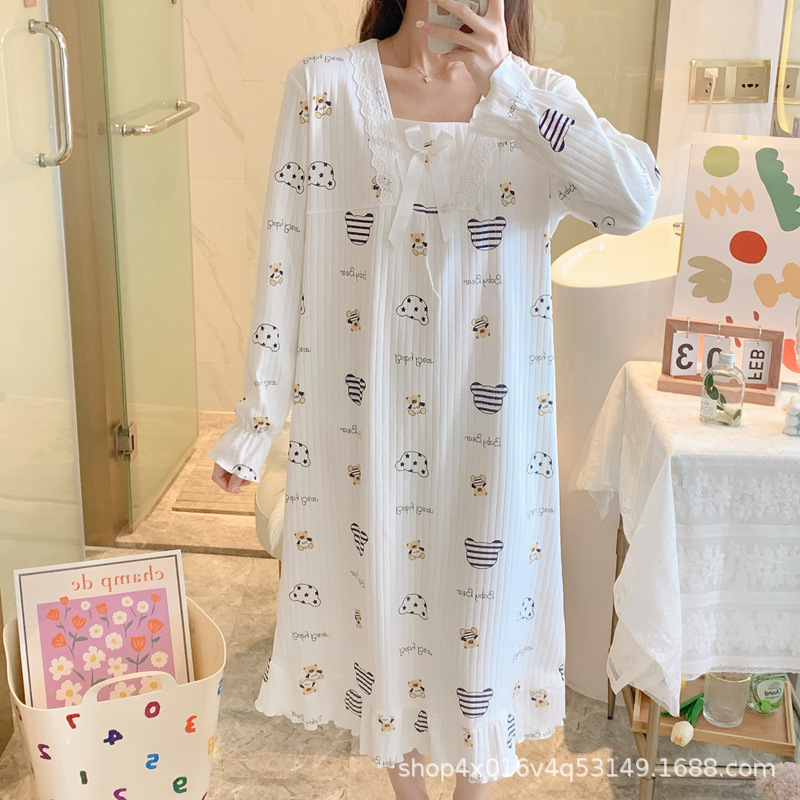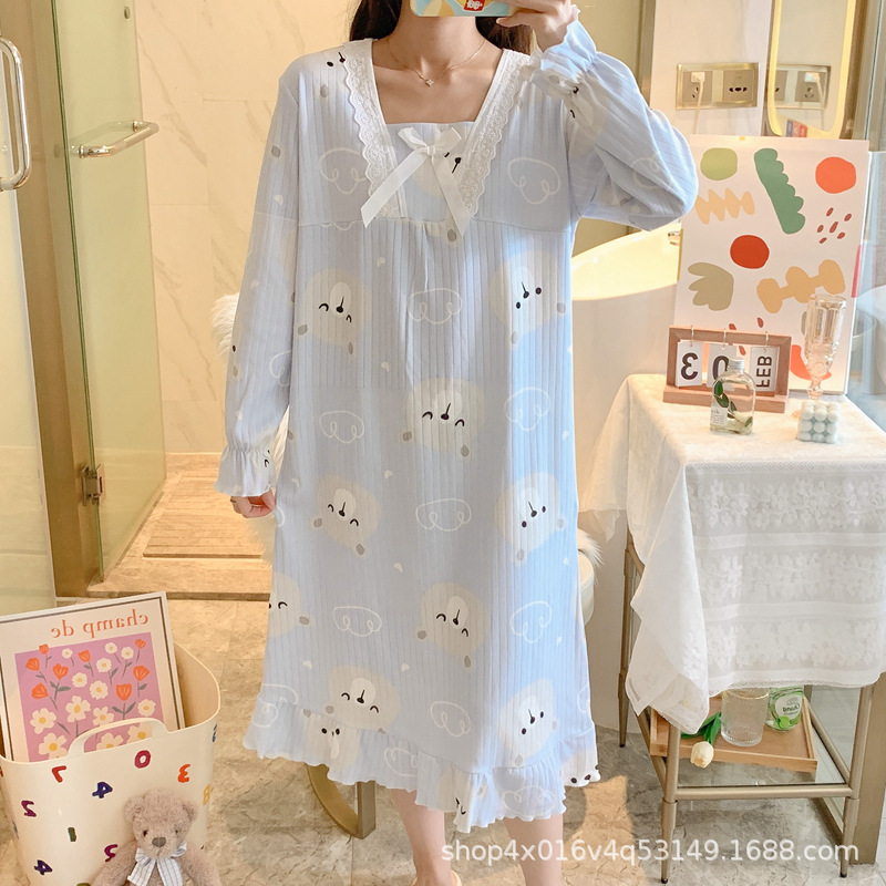 잠옷 잠옷 여자의 봄과 가을 새로운 긴 소매 귀여운 인형 칼라 공주 스타일 잠옷 겉옷 원피스