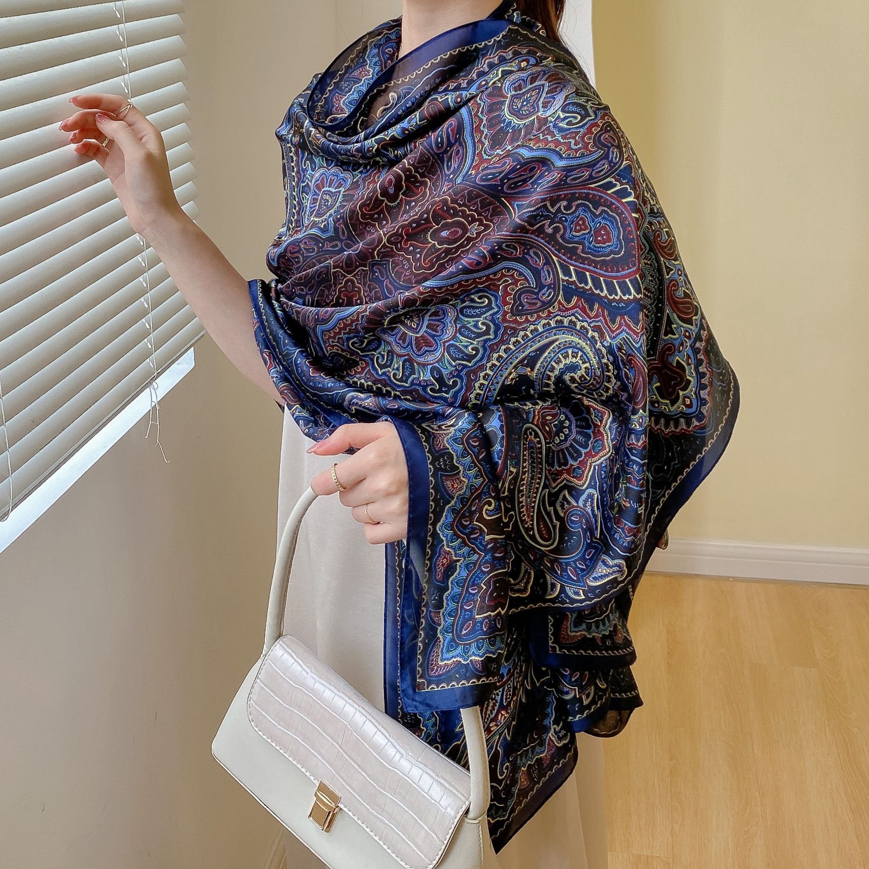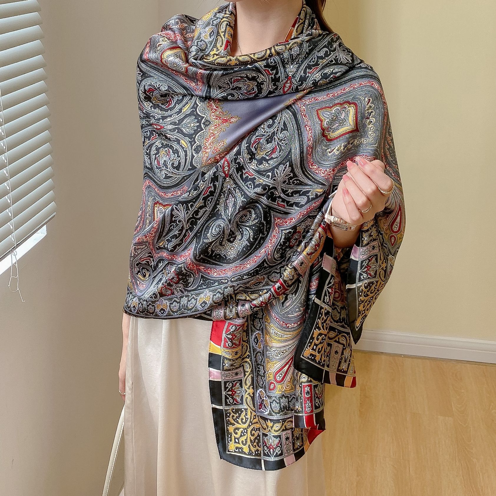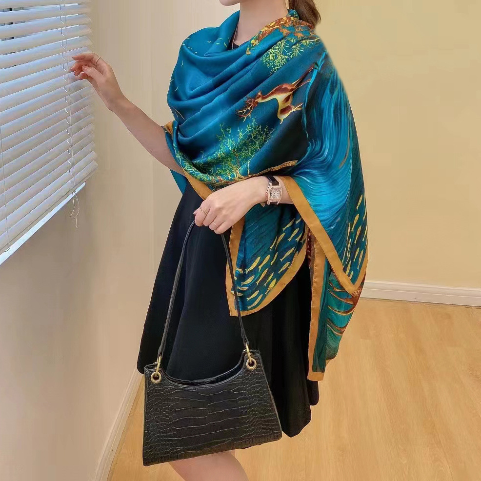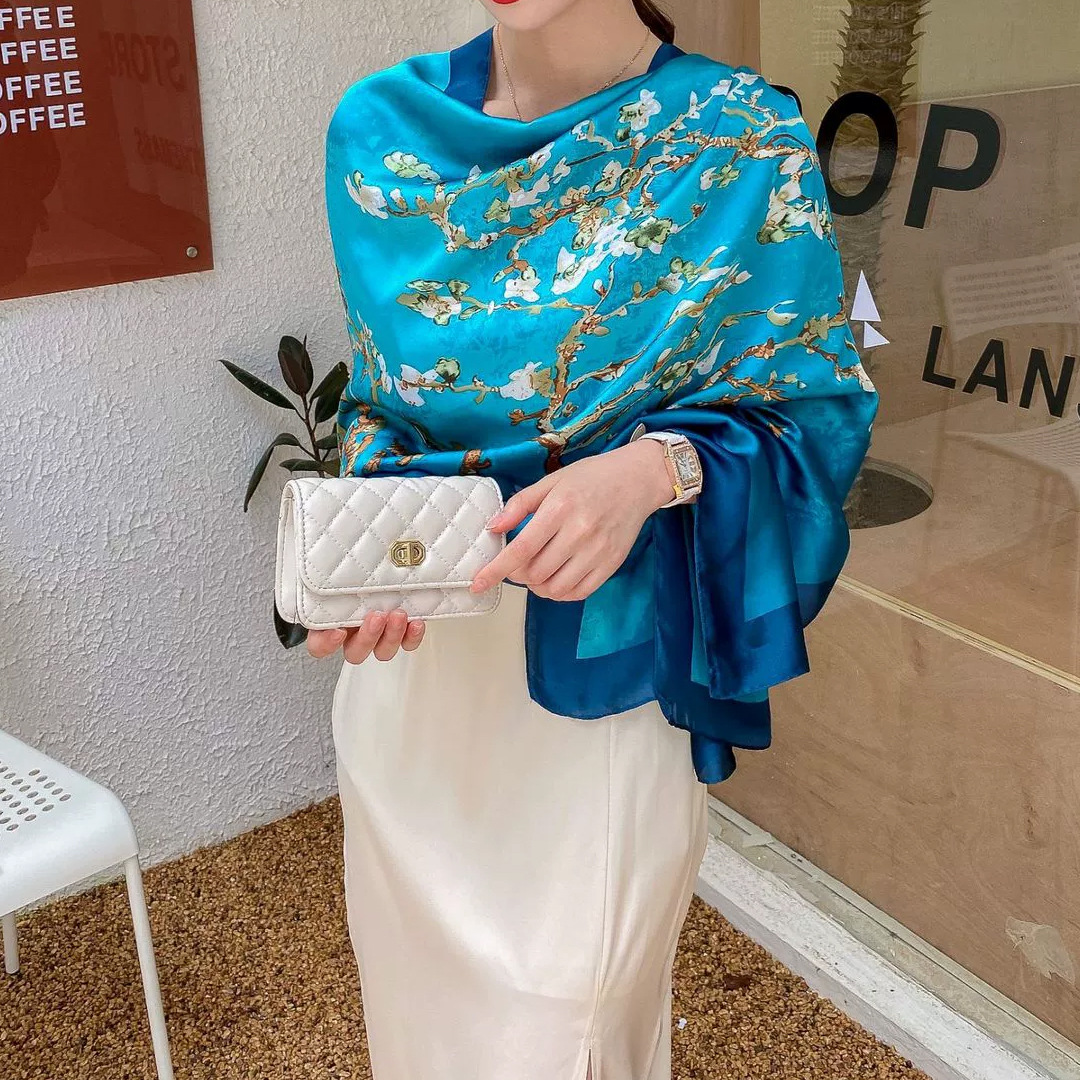 한국 스타일 유행 간단한 향기로운 구름 캐슈 패턴 긴 실크 스카프 봄 여름 가을 실크 여성의 외부 선 스크린 목도리스토어 가기