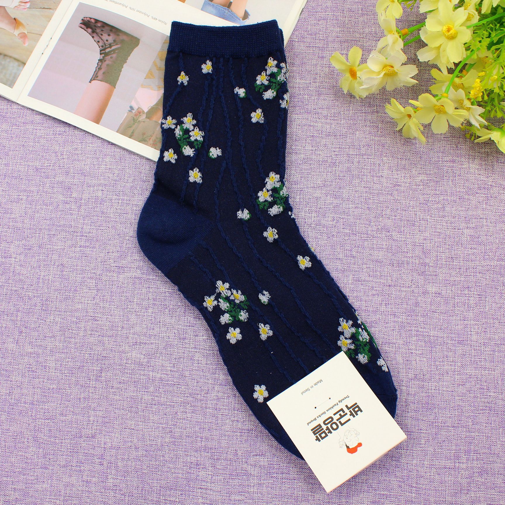 WF-106 한국 동대문 양말 가을 새 나선형 패턴 작은 꽃 여성 중간 크기 양말 한국식 여성용 양말스토어 가기