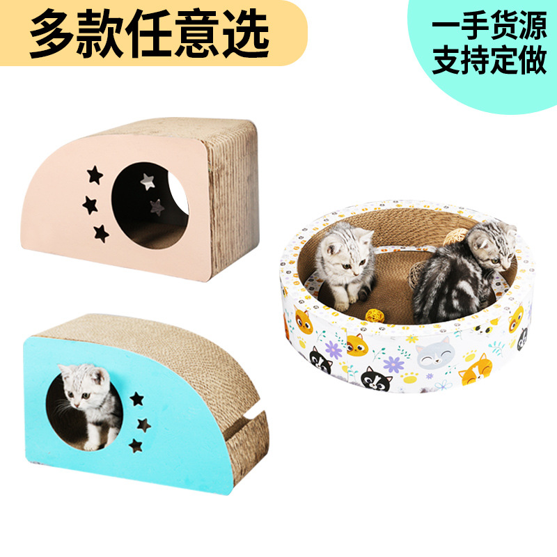 공장 맞춤형 고양이 스크래치 보드 애완 동물 고양이 연삭 발톱 장난감 용품 고양이 스크래치 보드 원형 삼각형 골판지 고양이 하우스