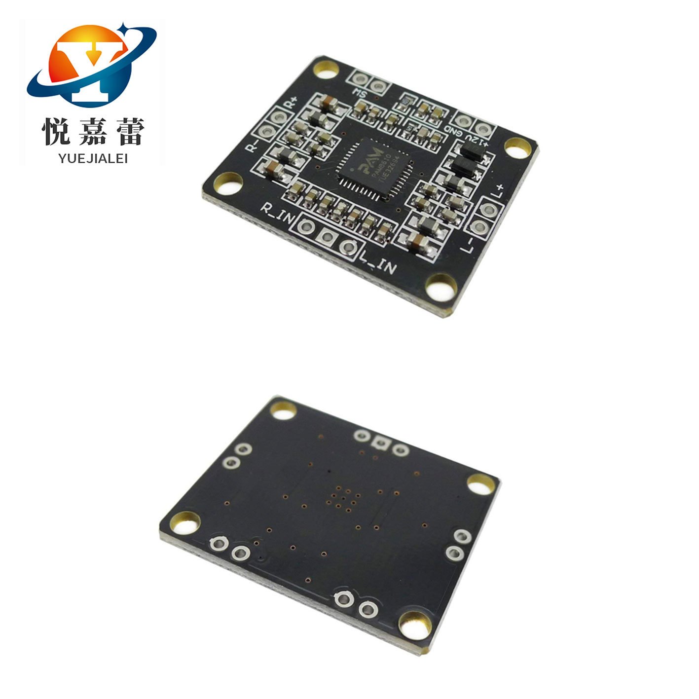 1、板载PAM8610音频放大芯片,10W*2无滤波器立体声D级音频放大器