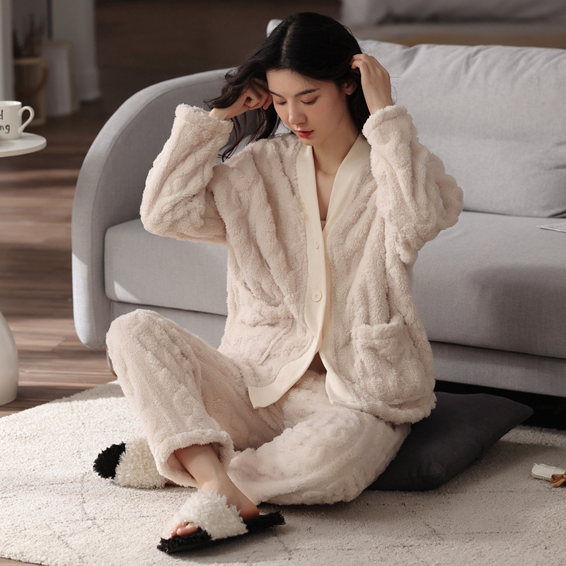 새로운 가을과 겨울 잠옷 여자의 플란넬 두꺼운 자카드 플러스 사이즈 인터넷 뜨거운 커플 홈 의류 라이브 재고