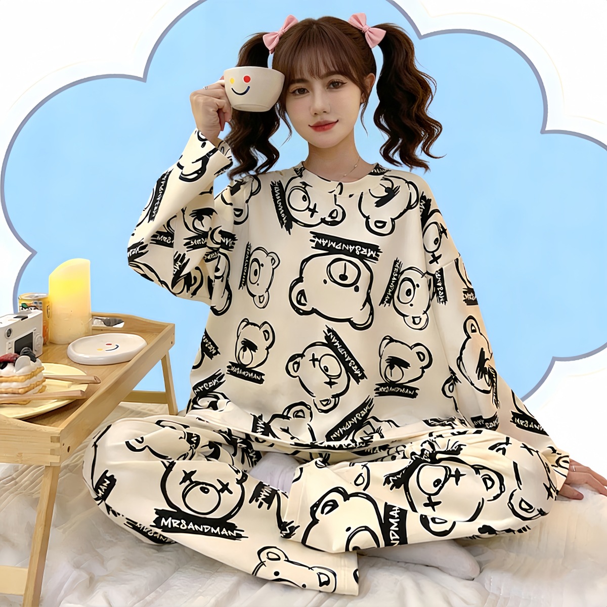 긴팔 잠옷 여성 가을과 겨울 봄과 가을 한국식 새로운 플러스 사이즈 숙녀 가정 옷 귀여운 만화 잠옷 세트 크로스 보더