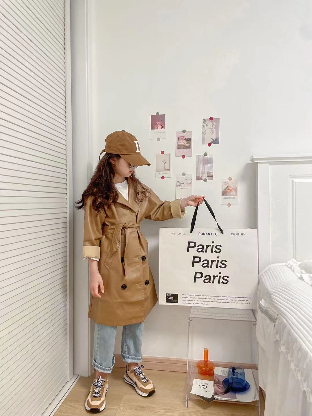 여자 한국어 버전 2025 봄, 가을, 겨울 라펠 더블 브레스트 PU 가죽 윈드 브레이커 허리 오토바이 중간 길이 가죽 자켓스토어 가기