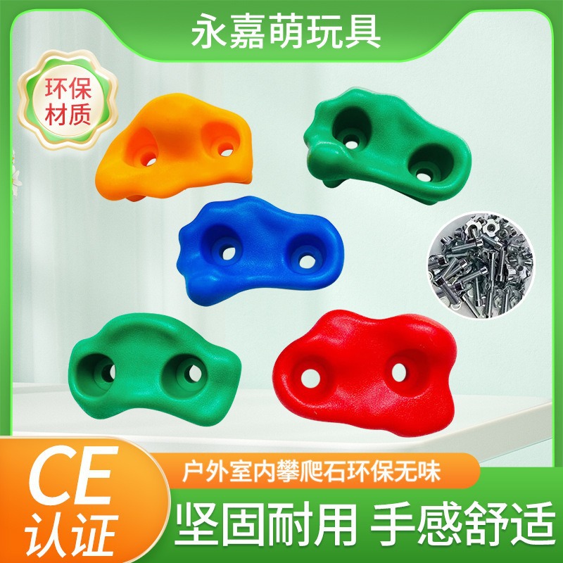 宝贝材料:无毒无味防紫外线塑料《注塑成型》非常结实耐用,颜色鲜艳。 本岩点形状由本公司新研发设计,手感舒适.无论各个方向安装都不影响手感及手抓效果,材质采用无毒无味防紫外线塑料《注塑成型》非常结实耐用,颜色鲜艳,大人和小孩都可以使用哦! 另外我店岩点全部根据大小配套了高强度的专用螺栓和工具,这是其他店铺没有的,同时也为你购买产品不必为配螺栓而东奔西走,为您提供了极大的便利。 包 装:纸箱《颜色随机发》 产品介绍: 安装地点:幼儿园,学校,游乐园,地下教室,走廊,室外建筑物墙壁等,由自己喜好随意选择(人造仿真岩壁、混凝土墙壁、有窗户的墙壁 、间壁等等). 安装儿童人造岩壁的目的与效果: 攀登人造岩壁{简称攀岩}可增强体力,可培养儿童的胆量可提高教育效果攀岩活动与其他运动相比,活动范围小,且属于静态运动不需要激烈的身体动作,就可以锻炼四肢还可活动全身,是一种全身负重训练,特别是可以发达胳膊与上体肌肉保持强健的体魄.有了强健的体魄就可培养付任何事情的自信心.为孩子培养冒险心理.发挥冒险性.只有以优良的创造力和体力为基础才是可能的.目前现有的传统玩具如秋千.滑梯中同时可培养创造离和体力的并不多,而攀岩活动即可培养儿童胆量.提高对恐惧的适应力.精神集中力.又可锻炼身体的平衡感觉及柔软性. 安装方法. 1.用电锤在墙上钻上一个3-4厘米的洞 2.用内胀钉轻轻敲入洞内与墙面齐 3.用一个直径约9毫米的钢锥把内胀钉撑开 4.用螺丝穿过岩石拧入内胀钉.用六角扳手拧至岩点不滑动. 5.10的钻头 注意:不要用力过猛拧碎岩点。 安全提示:儿童攀爬需大人监护,安装过高必须有保险带装置(底部垫上缓冲海绵垫)