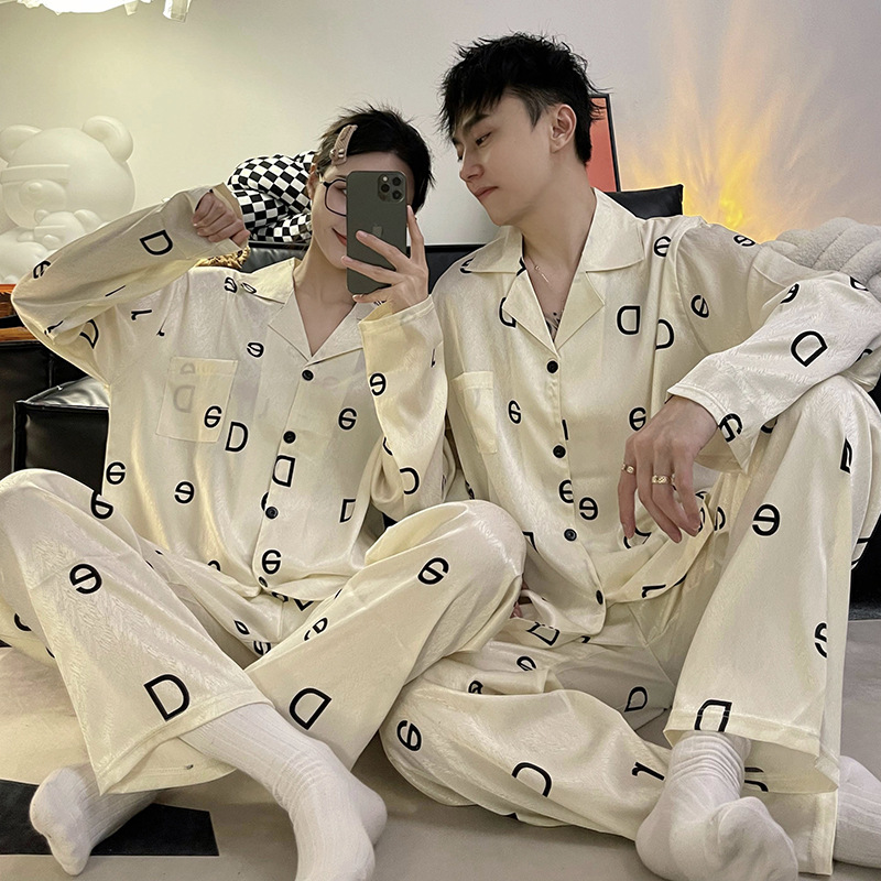 커플 잠옷 여성의 봄과 가을 아이스 실크 긴 소매 인터넷 인기있는 광장 2024 새로운 플러스 사이즈 남성 실크 홈 의류 겨울