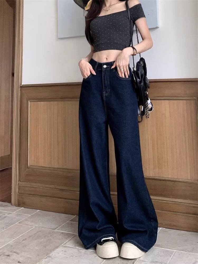 여름 새로운 한국 스타일 청바지 여성의 느슨한 봄, 가을 진한 파란색 아빠 허리 슬리밍 넓은 다리 바지 유행 겉옷스토어 가기