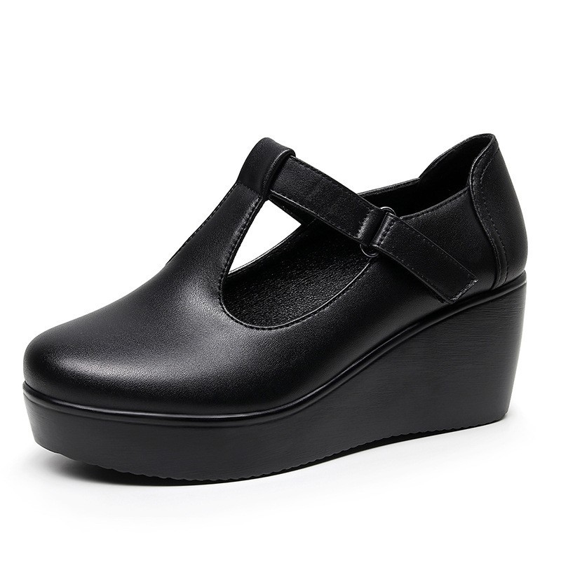 둥근 발가락 쐐기가있는 T 자형 부드러운 밑창 어머니 가죽 신발 봄과 가을 방수 플랫폼 두꺼운 밑창 머핀 여성용 로우 뱀프 벨크로 싱글 레이어 신발스토어 가기