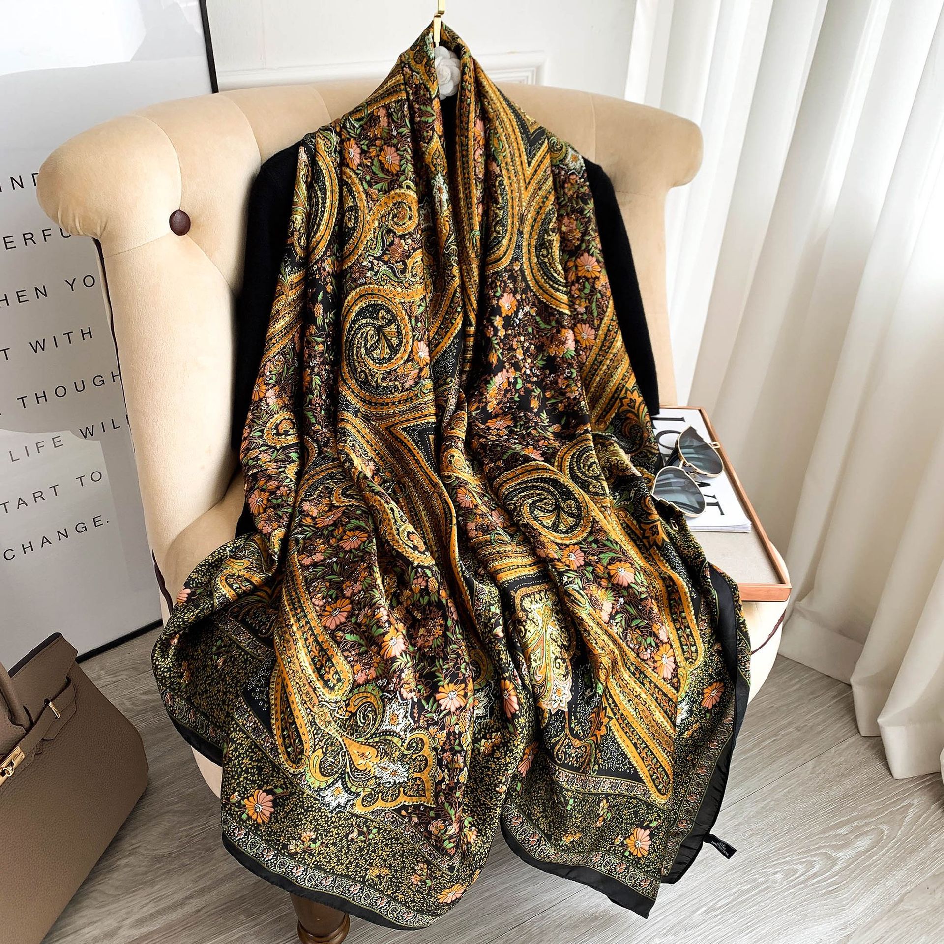 2021 한국 스타일 신상품 꽃 패션 인쇄 실크 스카프 패션 가짜 실크 장식 복고풍 따뜻한 스카프 이중 목적 숄