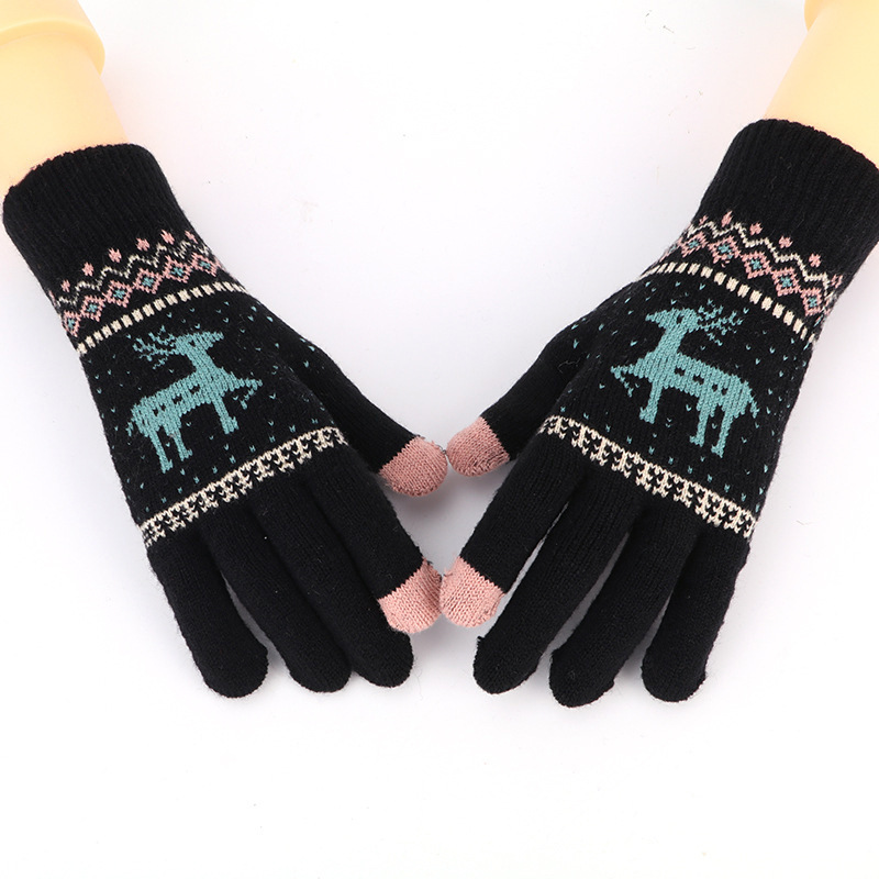 가을 겨울 장갑, 귀여운 만화 사슴 자카드 여성용 터치스크린 니트 손가락별 방한 보온 인스 스타일 달콤하고 시원한