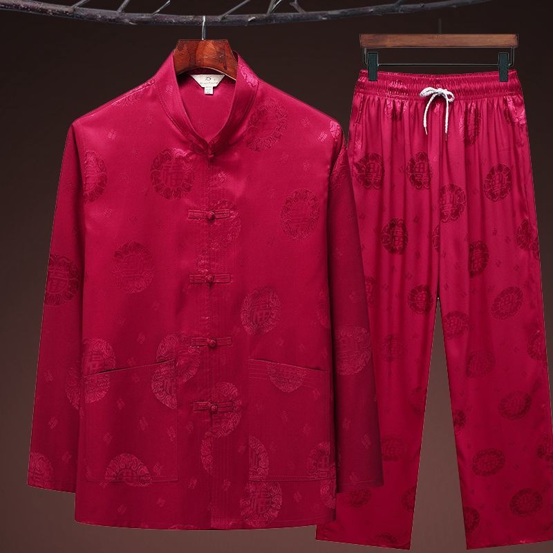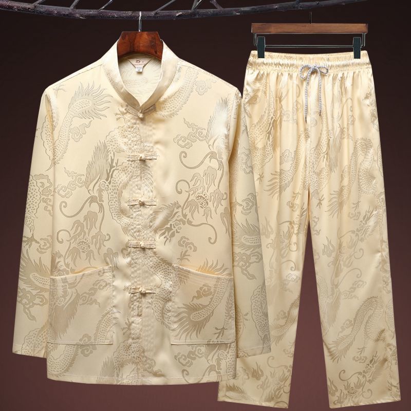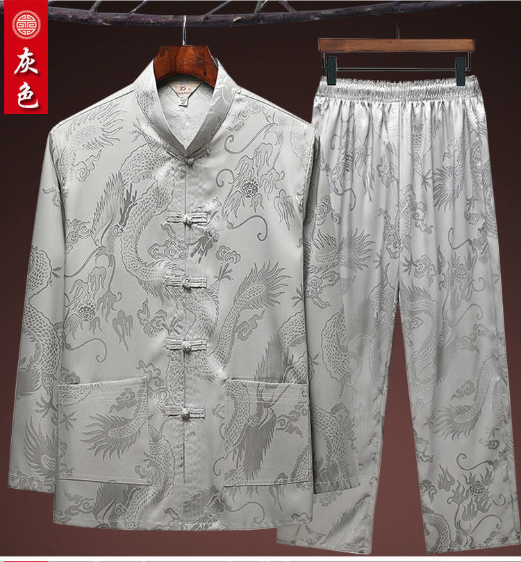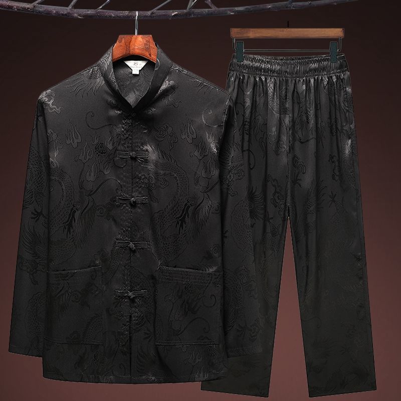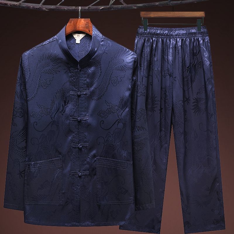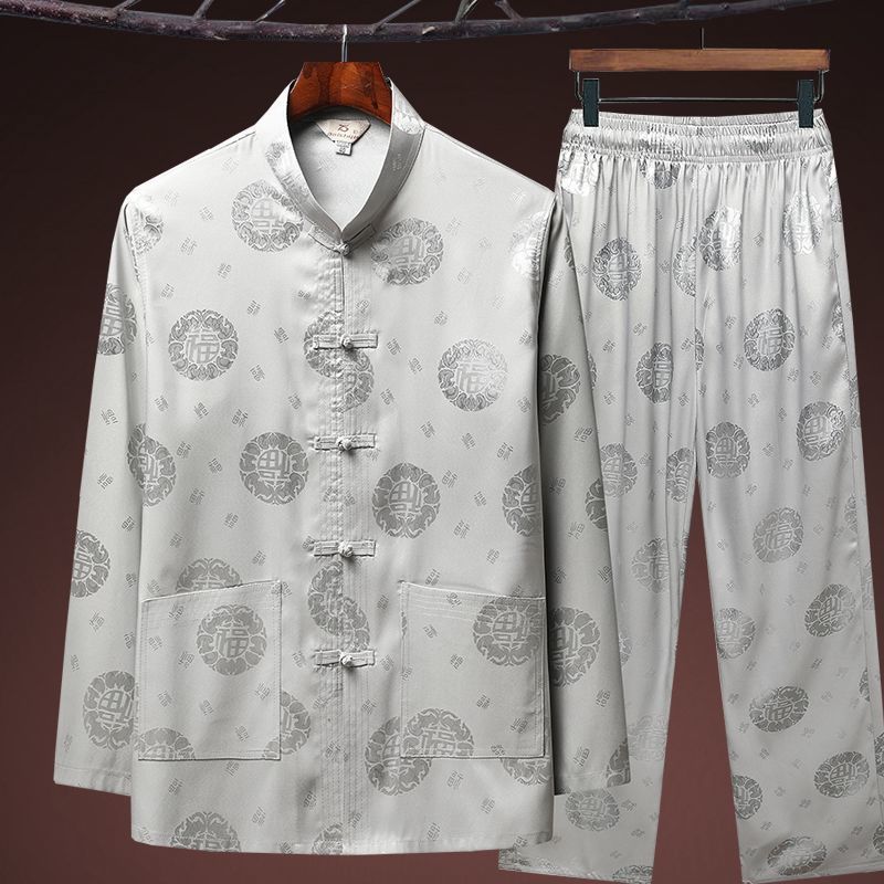 중국 봄과 여름 아이스 실크 중년 및 노인 당나라 세트 남자의 긴팔 가을 세트 아빠의 실크 할아버지의 Hanfu
