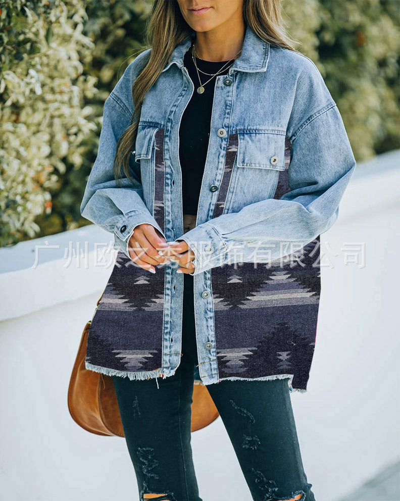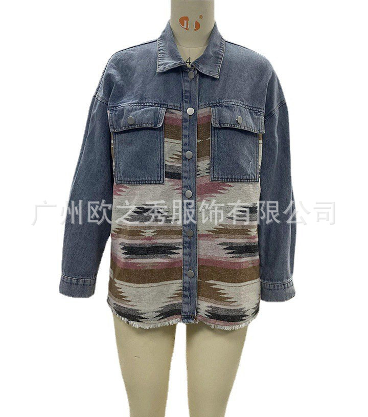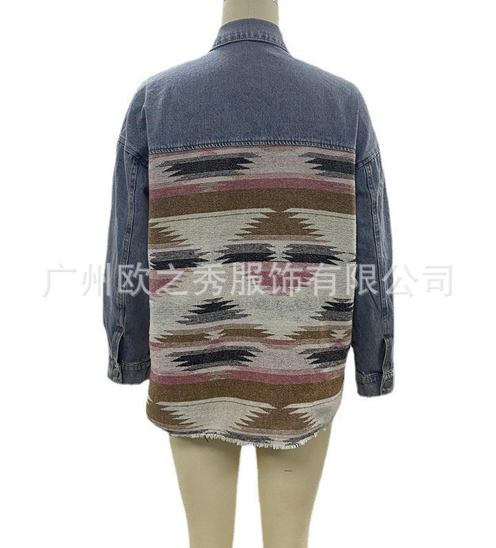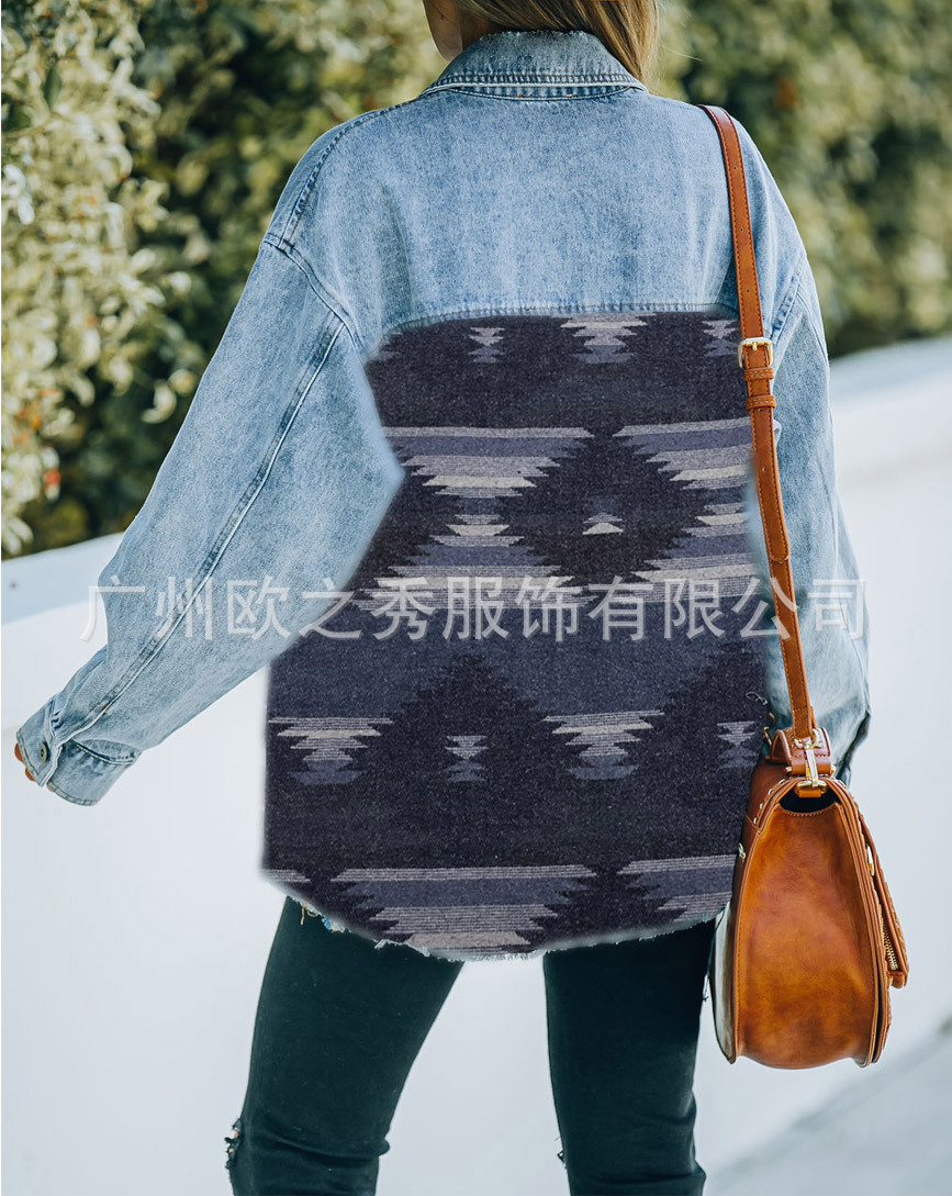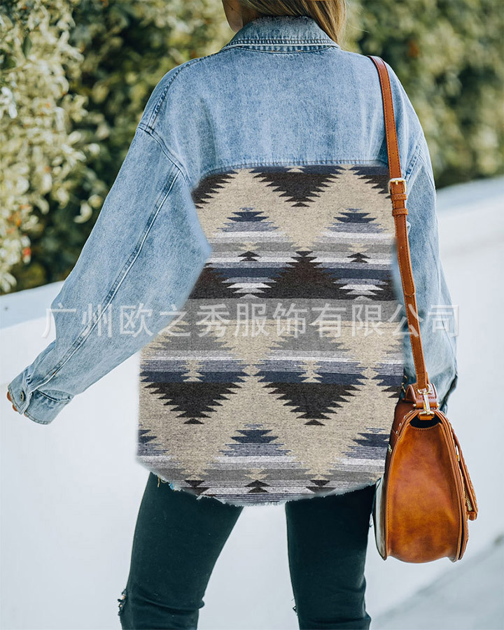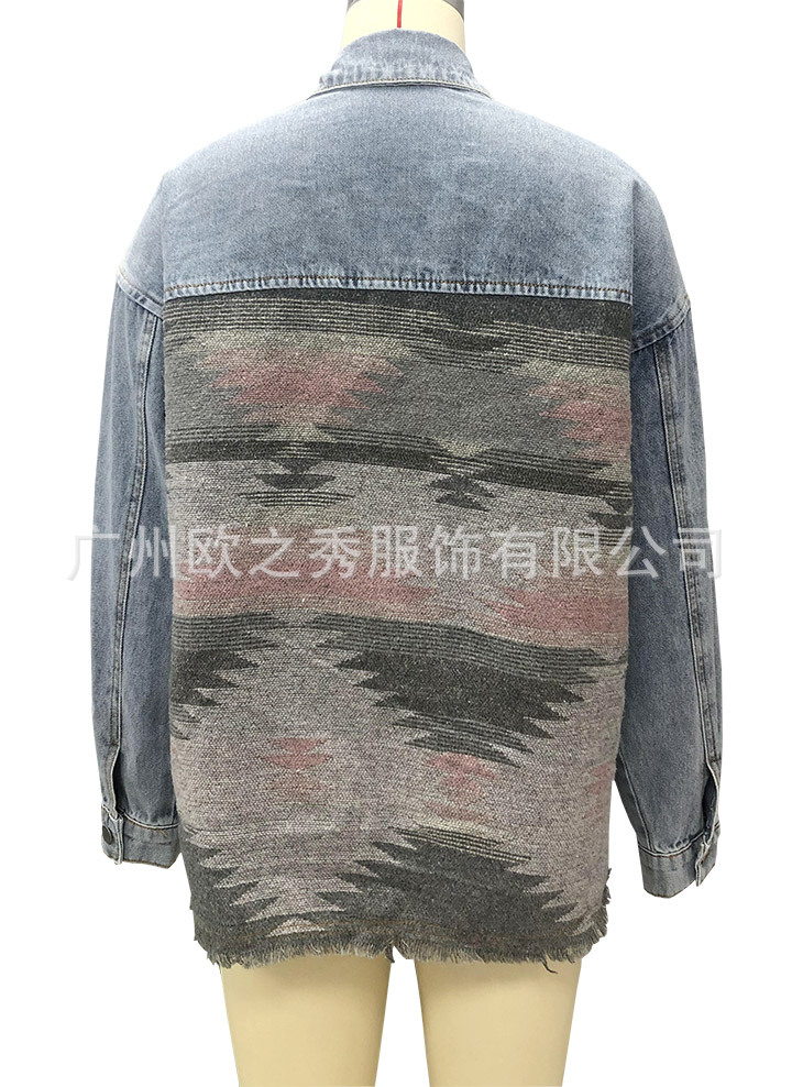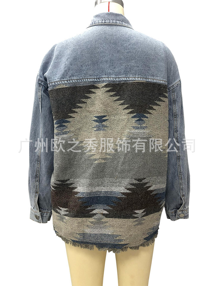 유럽과 미국의 봄과 가을 인기 AZTEC 데님 스플라이스 모직 재킷 여성용 복고풍 모직 중간 길이 재킷