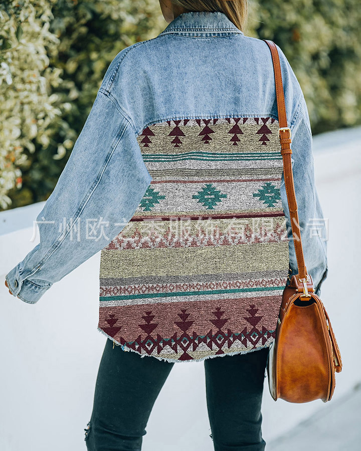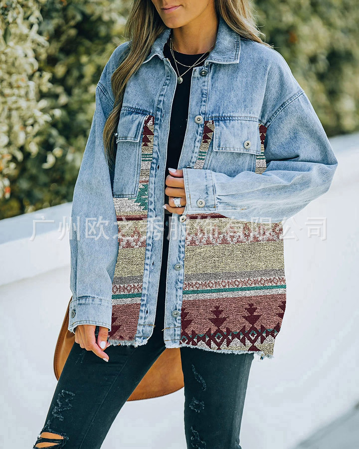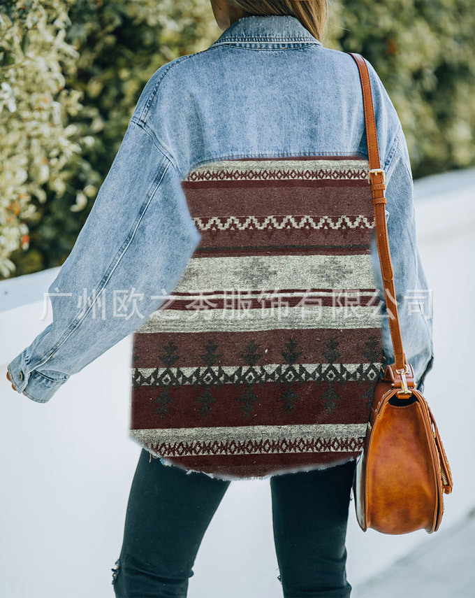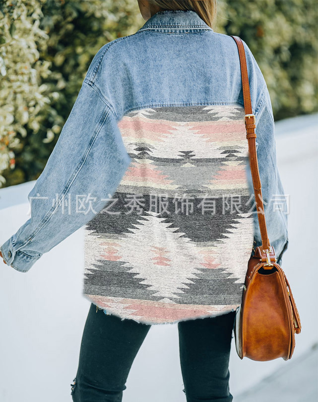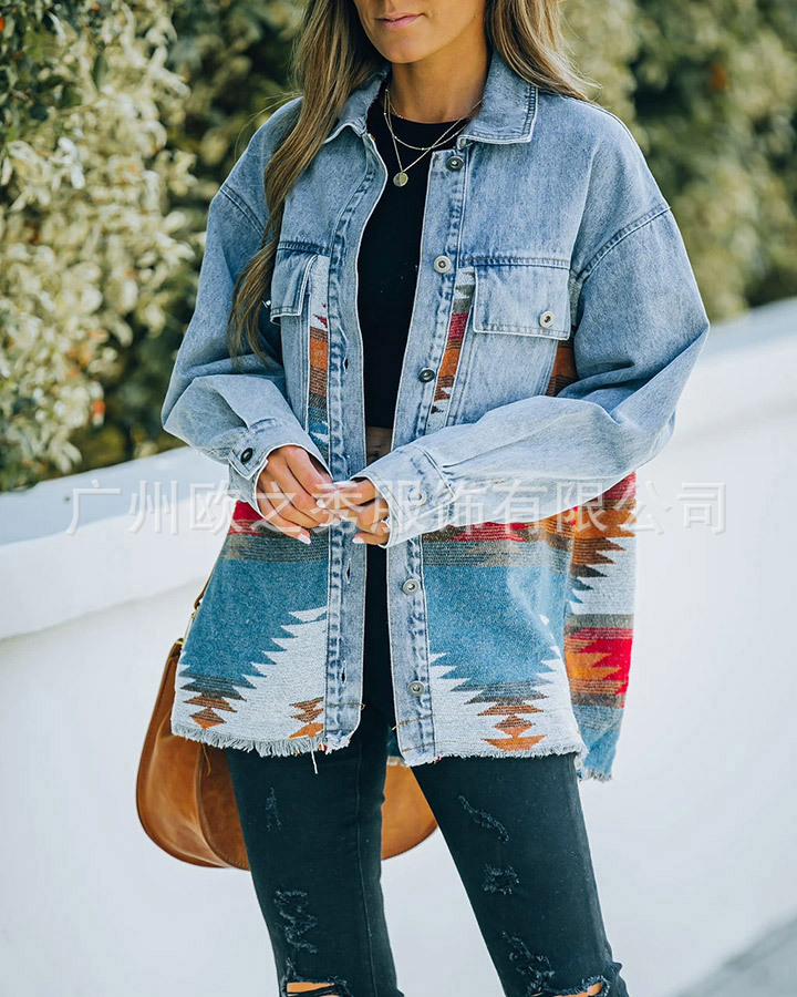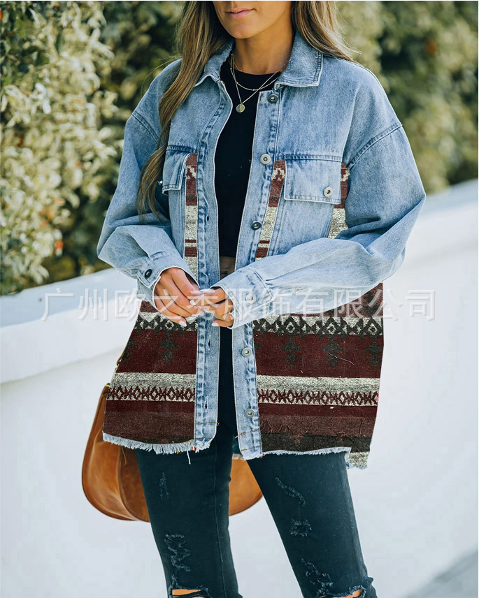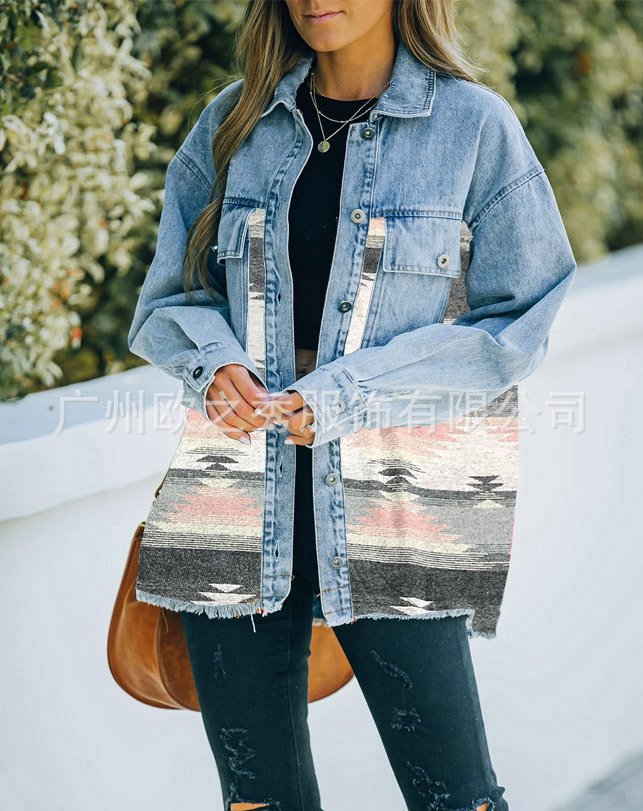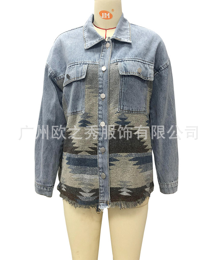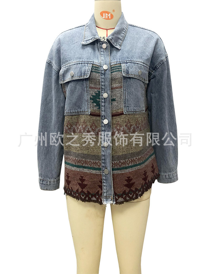 유럽과 미국의 봄과 가을 인기 AZTEC 데님 스플라이스 모직 재킷 여성용 복고풍 모직 중간 길이 재킷
