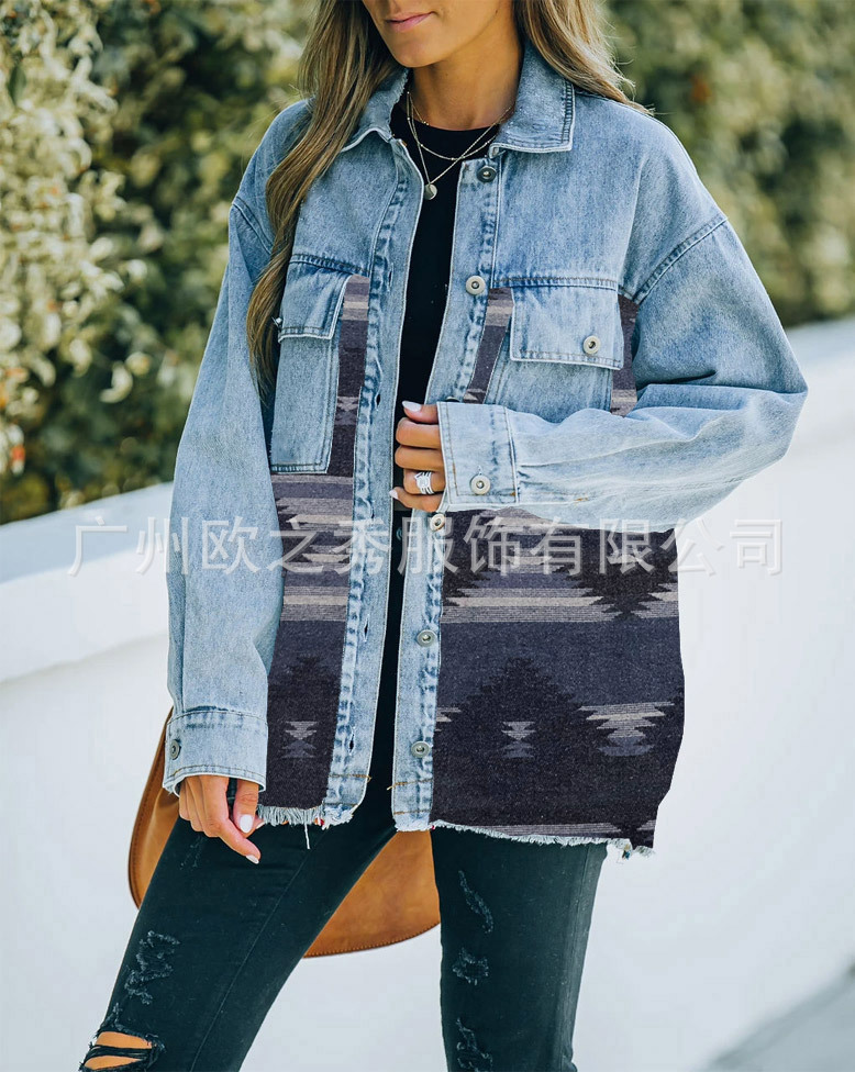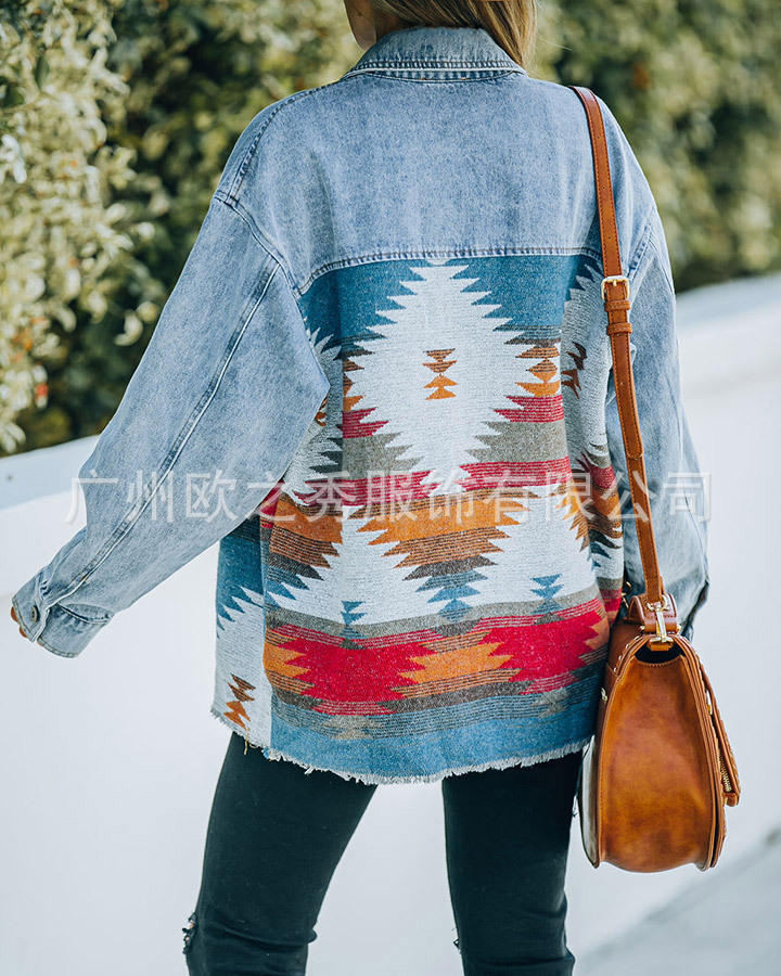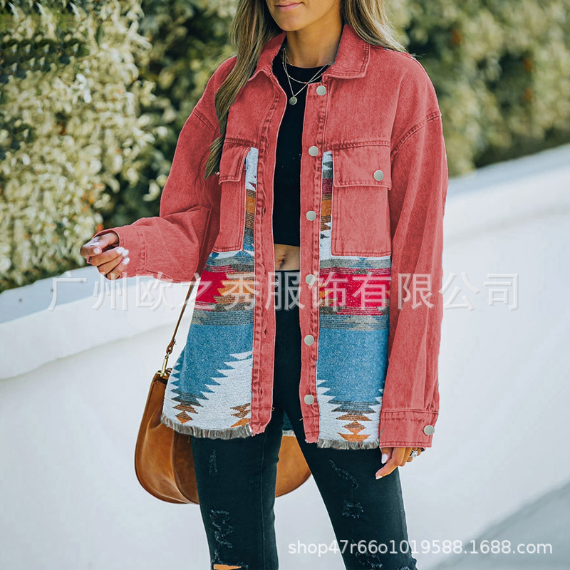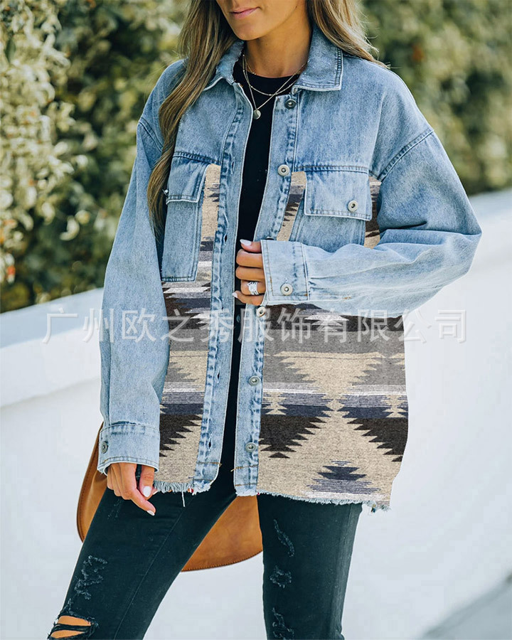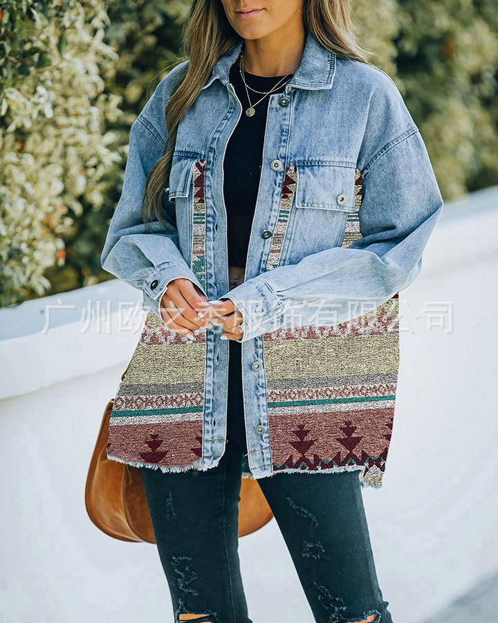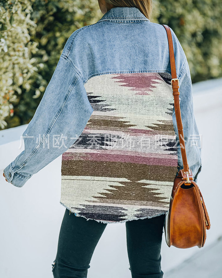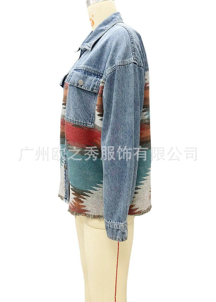 유럽과 미국의 봄과 가을 인기 AZTEC 데님 스플라이스 모직 재킷 여성용 복고풍 모직 중간 길이 재킷