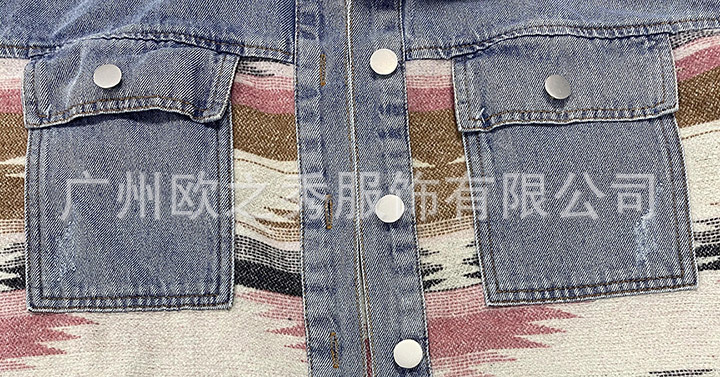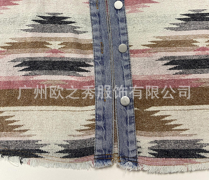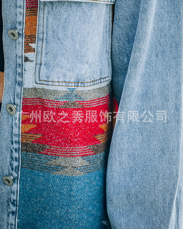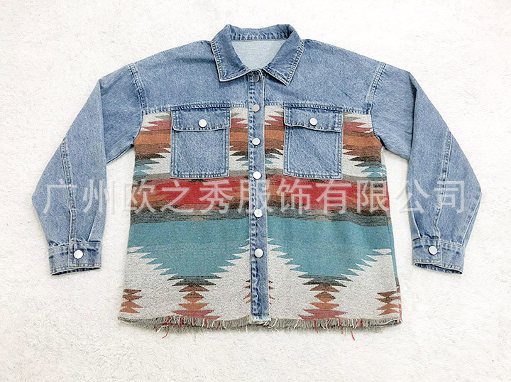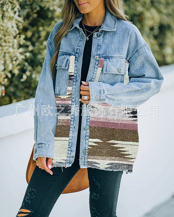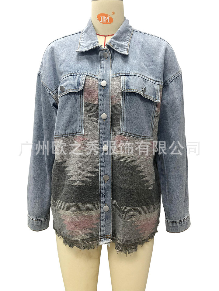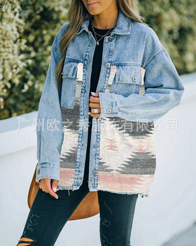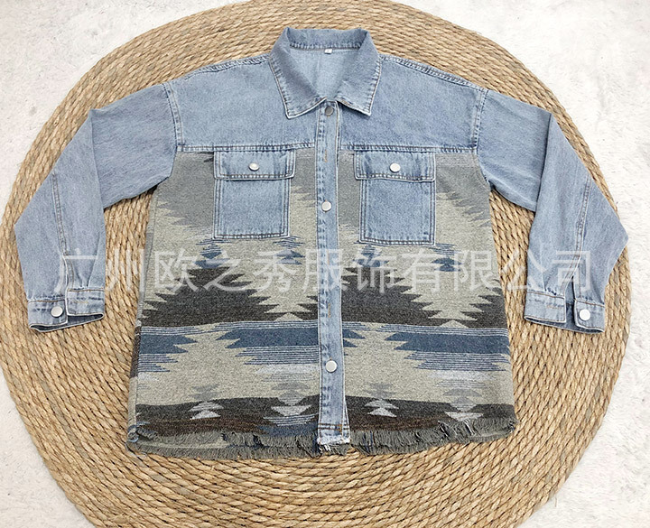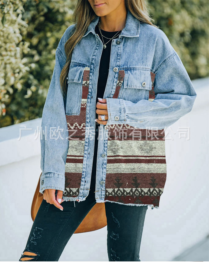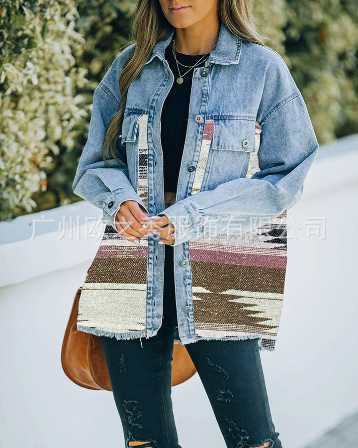 유럽과 미국의 봄과 가을 인기 AZTEC 데님 스플라이스 모직 재킷 여성용 복고풍 모직 중간 길이 재킷