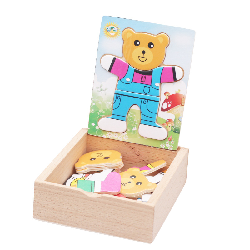 做工精美的小木盒盖上有凹槽,可爱的熊爸爸、熊妈妈、熊宝宝和熊妹妹可以让宝宝根据拼板的凹槽任意搭配衣服,帮小熊打扮打扮哦。。。锻炼宝宝的手眼协调能力和分辨能力。玩好后把拼版放入小木盒中,非常方便。是非常流行的一款玩具
