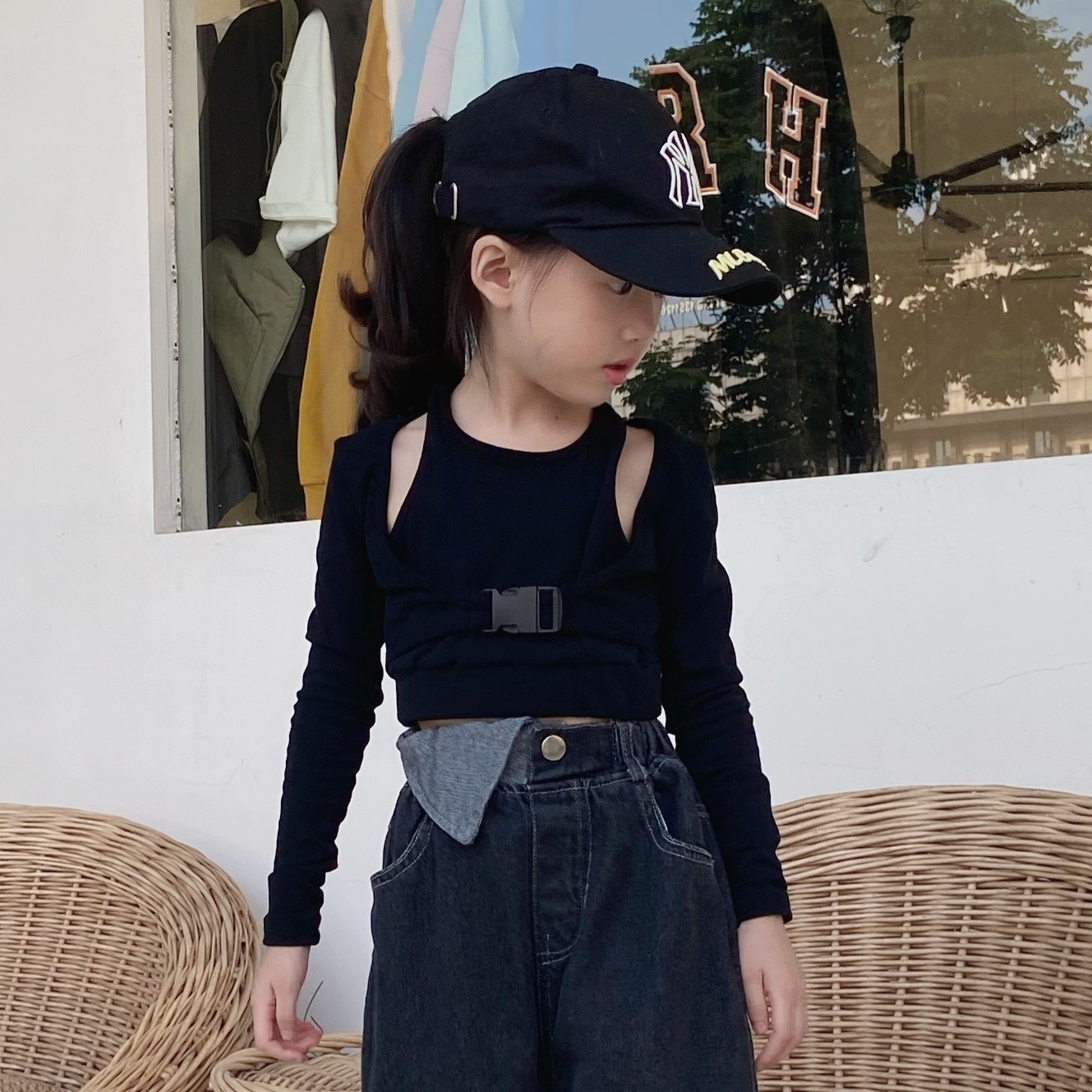 여아용 투피스 스타일 이너웨어, 세련된 한국 스타일의 멋진 여아용 숏 티셔츠 상의스토어 가기