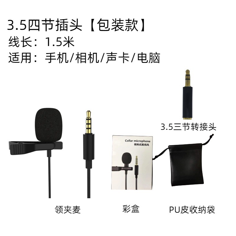 3.5mm四级:领夹麦克风+转接头+PU袋+说明 书+彩盒