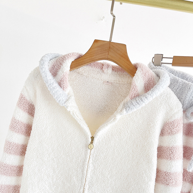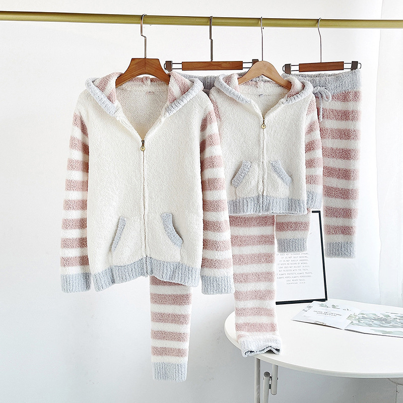 여자의 부드러운 파자마 바지 가을과 겨울 두꺼운 하프 사이드 벨벳 따뜻한 스트라이프 지퍼 후드 가디건 가정 의류 세트스토어 가기