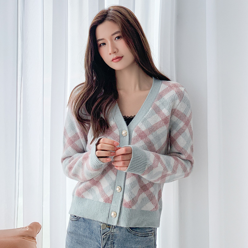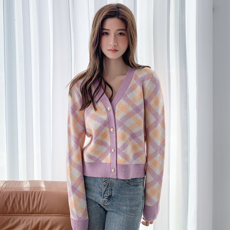 의류 가을 겨울 신상품 신선한 스타일 브이넥 스웨터 여성용 가디건 코트 짧은 스타일 배색 체크 니트 재고 정리스토어 가기