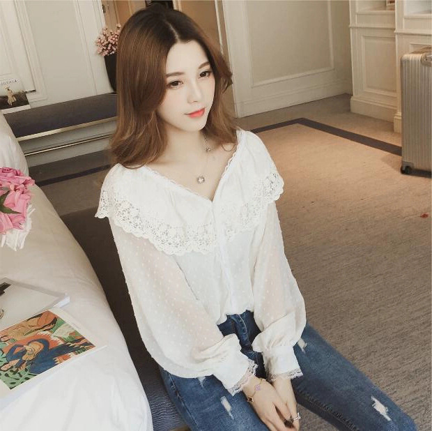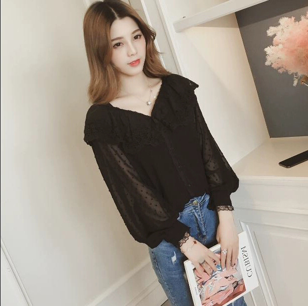 국경 간 가을 새로운 한국 패션 쉬폰 셔츠 여성 디자인 센스 틈새 세련된 프랑스 레이스 탑 작은 셔츠