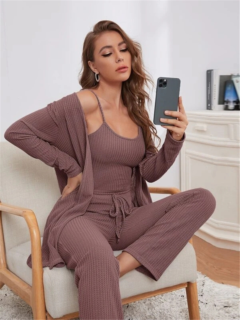 2024 뜨거운 판매 유럽과 미국의 홈웨어 여성 와플 니트 캐미솔 탑 바지 가운 잠옷 3 피스 슈트스토어 가기