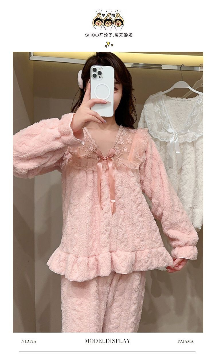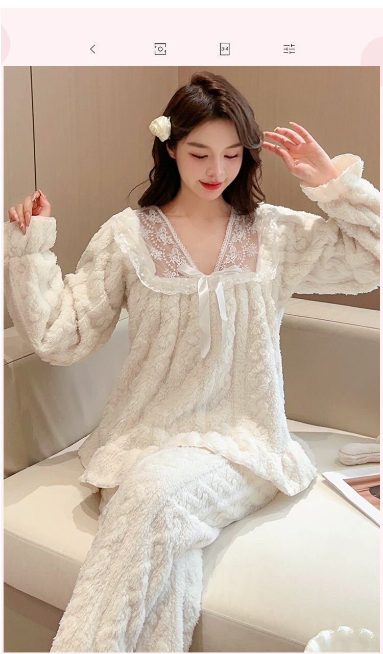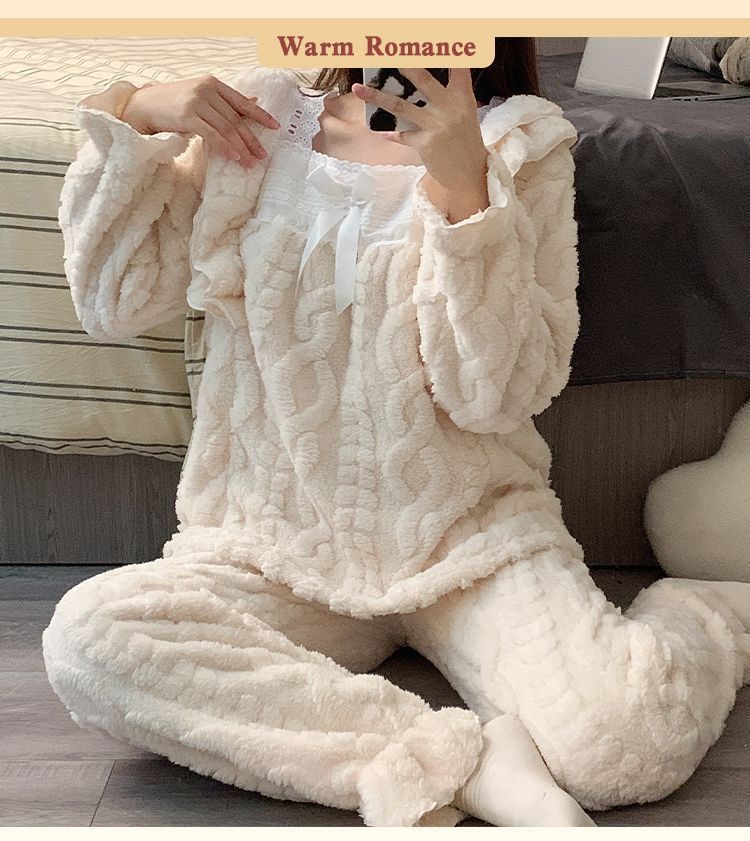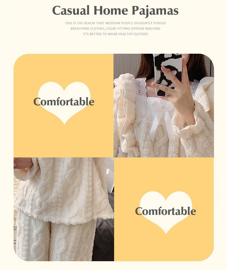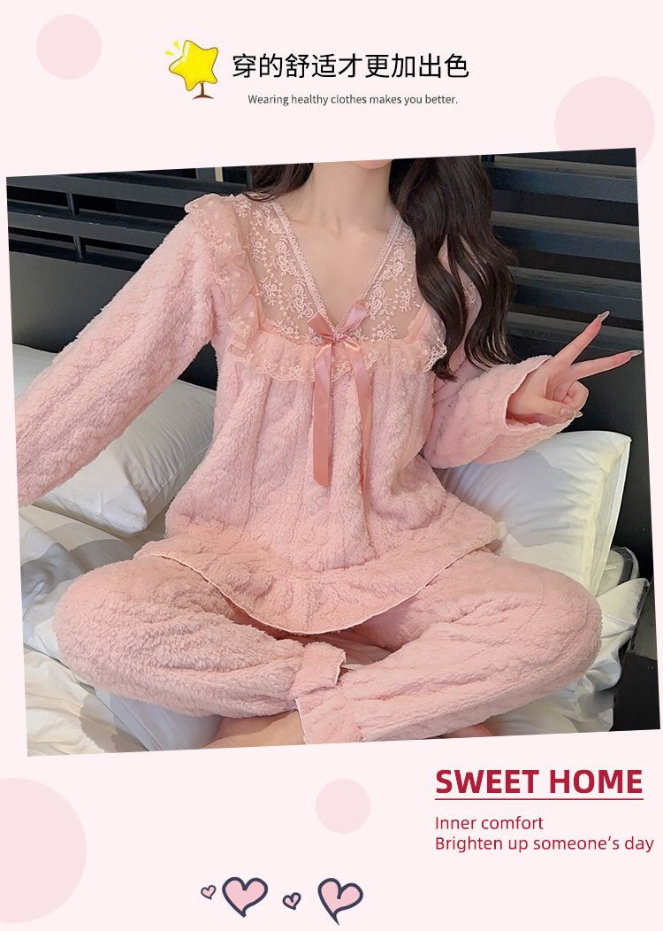 라이브 핫 잠옷 여자의 가을과 겨울 산호 양털 따뜻한 귀여운 달콤한 세트 양털 가정 옷 대량 할인