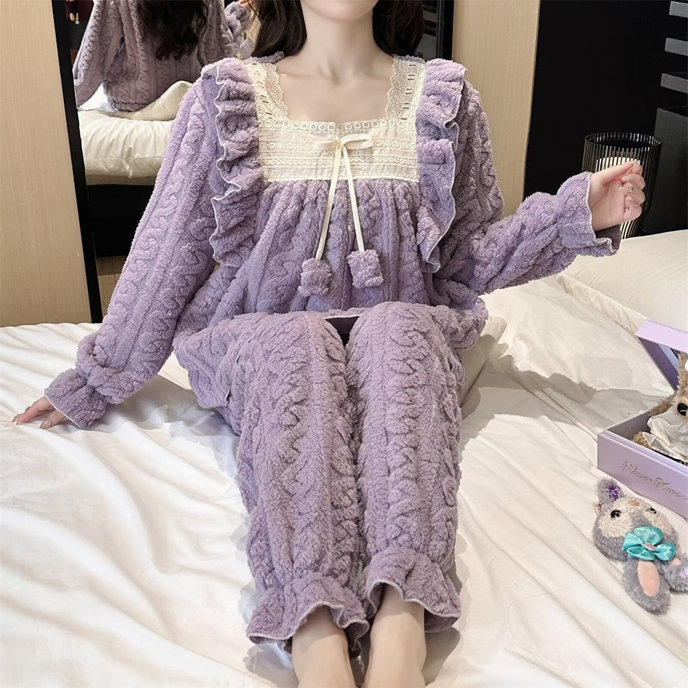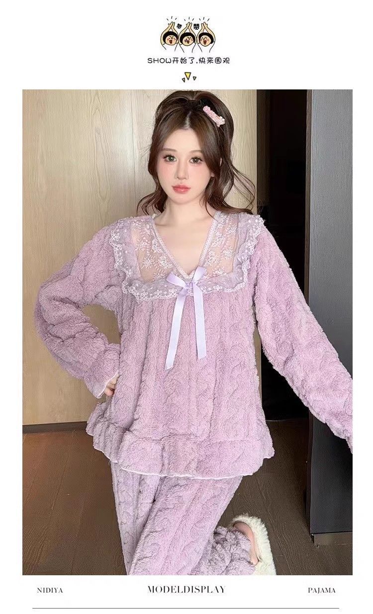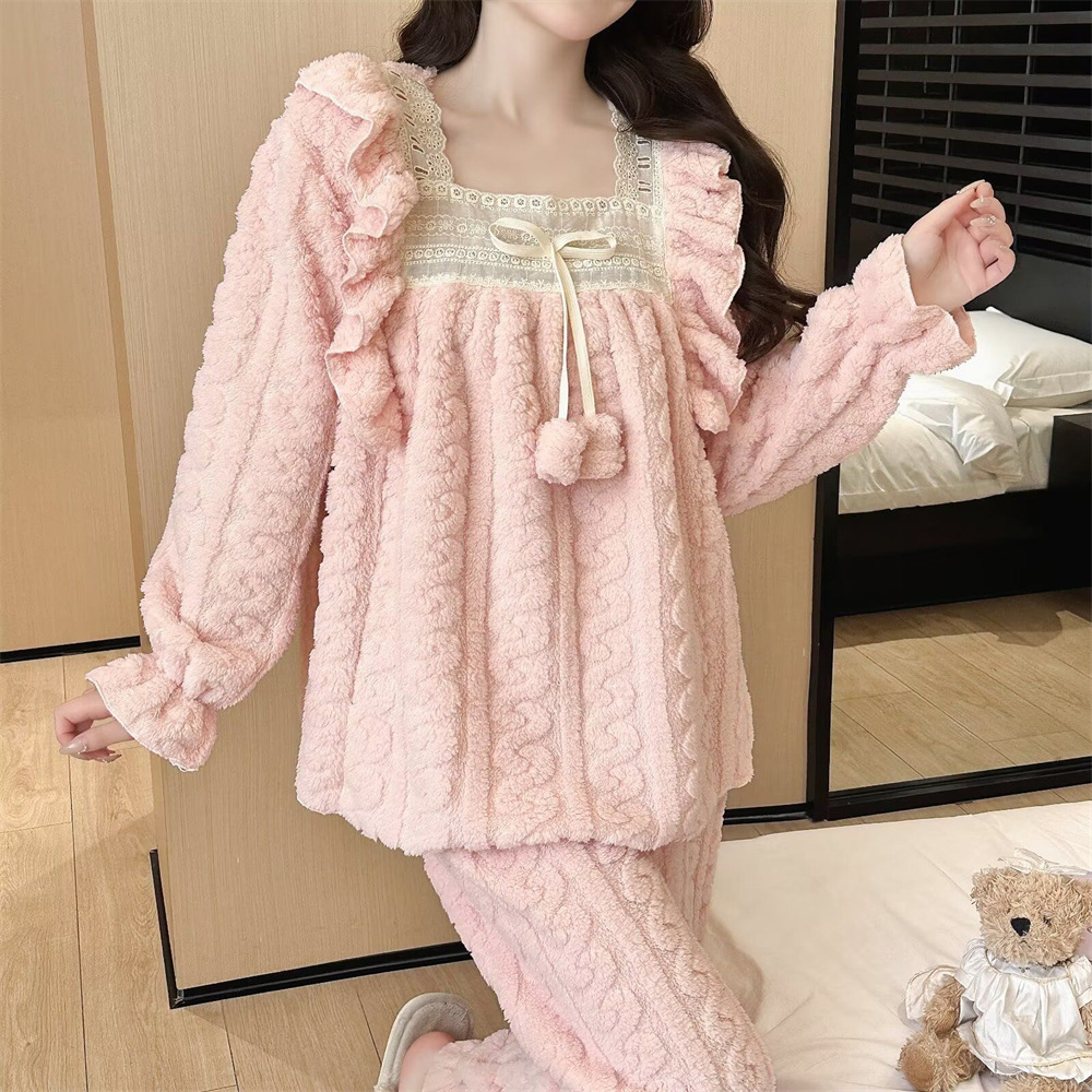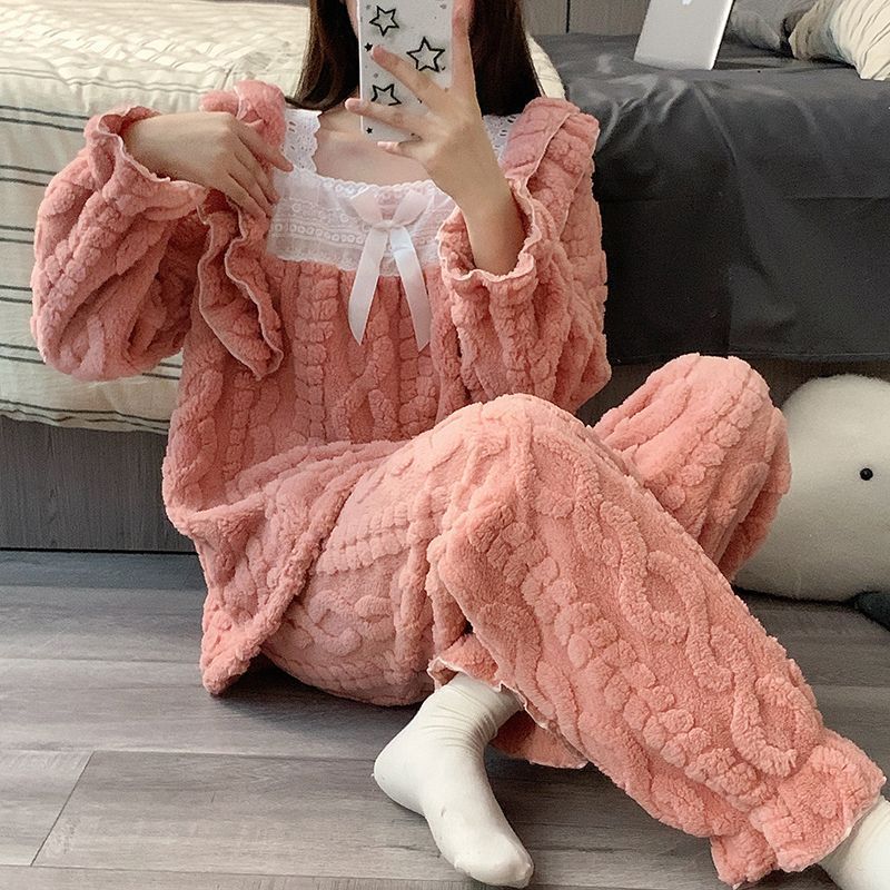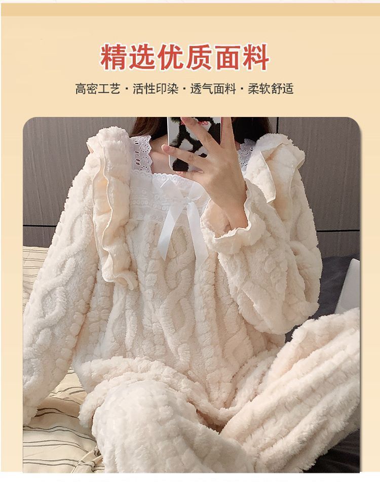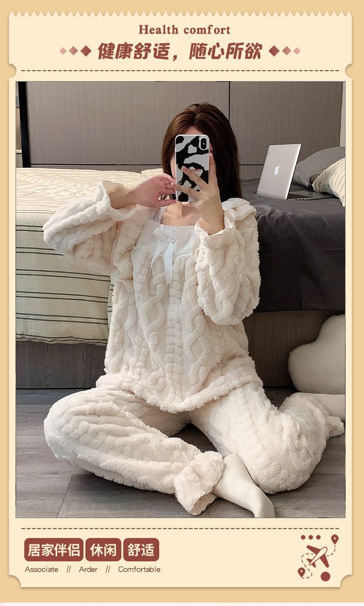 라이브 핫 잠옷 여자의 가을과 겨울 산호 양털 따뜻한 귀여운 달콤한 세트 양털 가정 옷 대량 할인스토어 가기