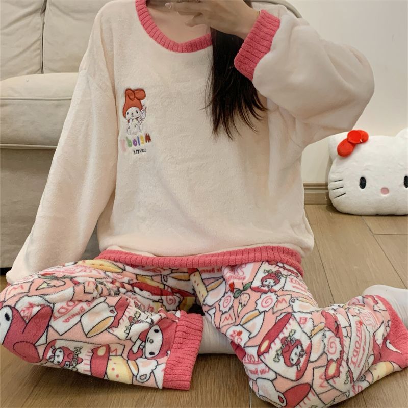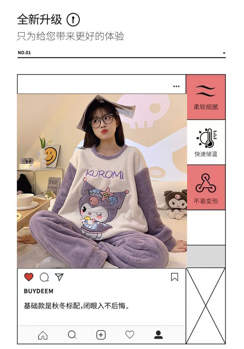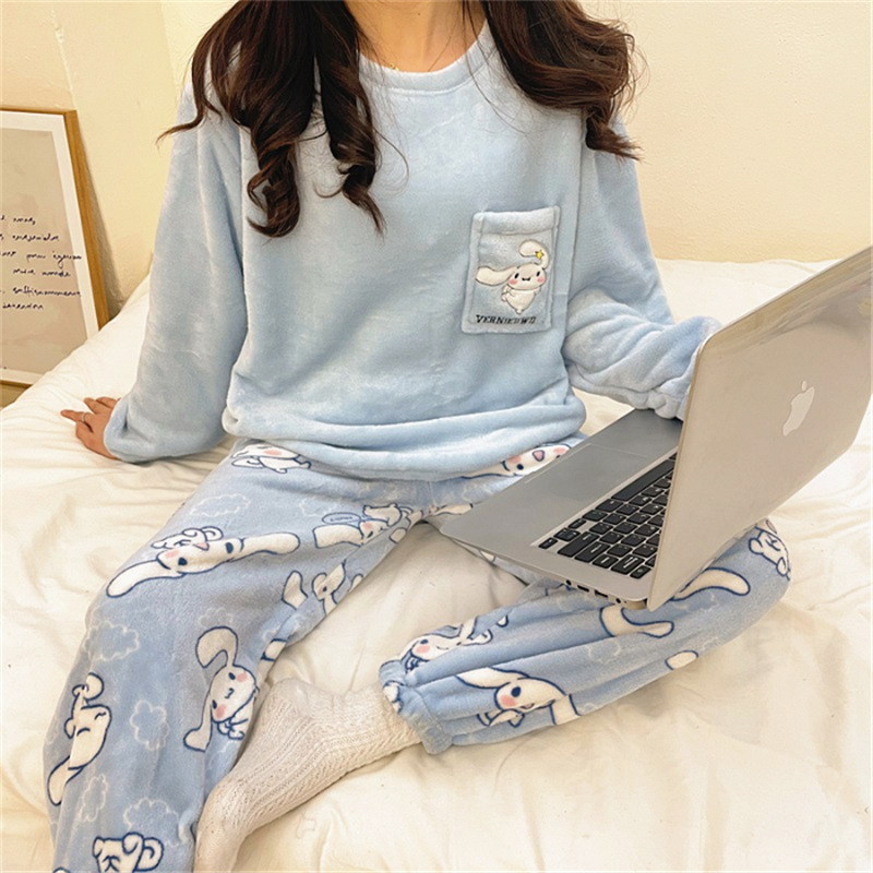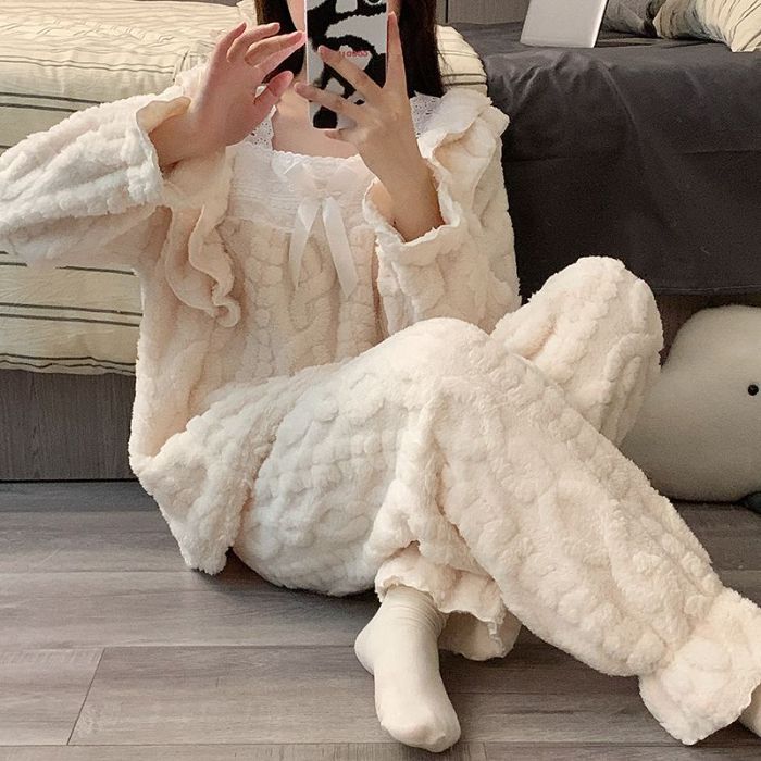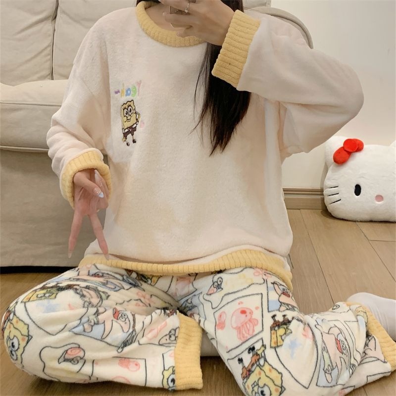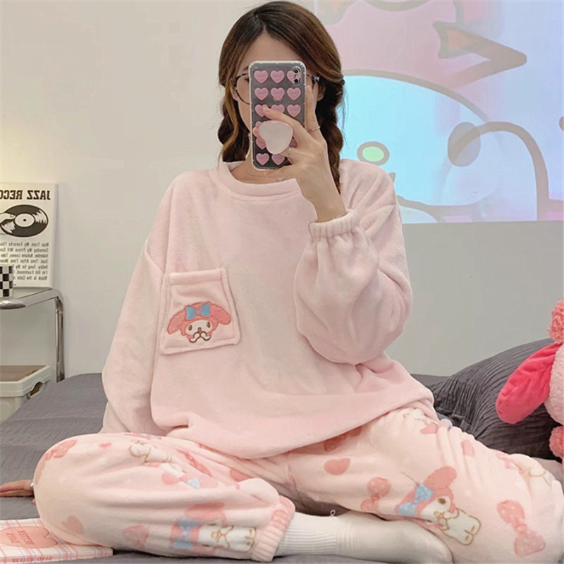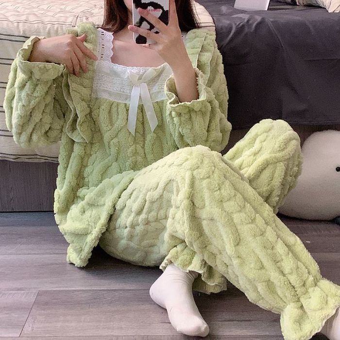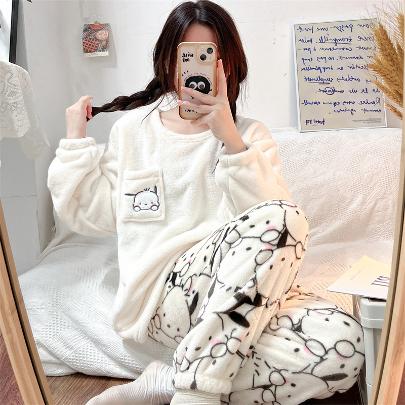 라이브 핫 잠옷 여자의 가을과 겨울 산호 양털 따뜻한 귀여운 달콤한 세트 양털 가정 옷 대량 할인스토어 가기