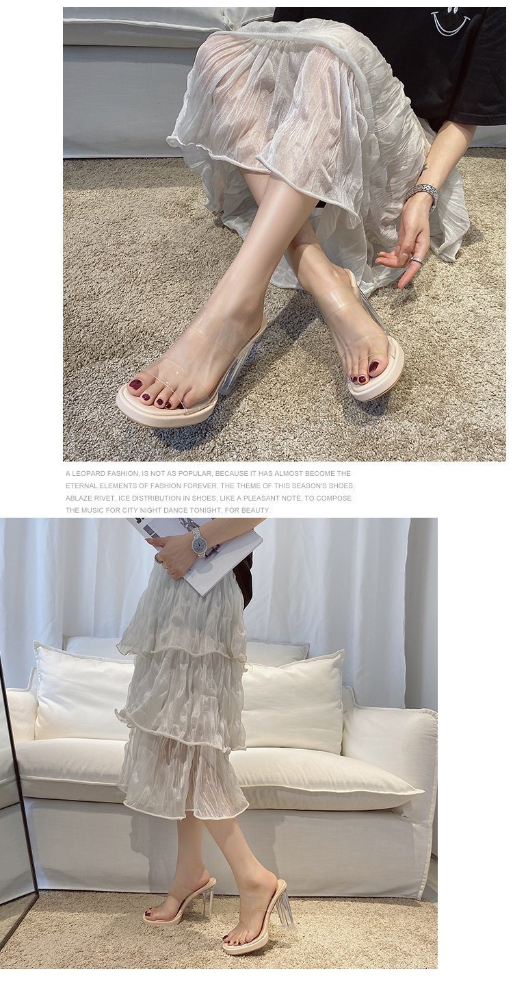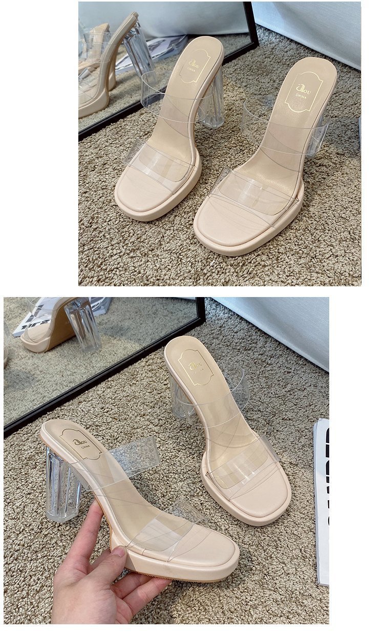 투명한 하이힐 샌들 및 슬리퍼 2025 여성 여름 신상 스타일, 외부 착용을 위한 패셔너블한 원스트랩 디자인, 외부 착용을 위한 튼튼한 굽과 고급스러운 느낌
