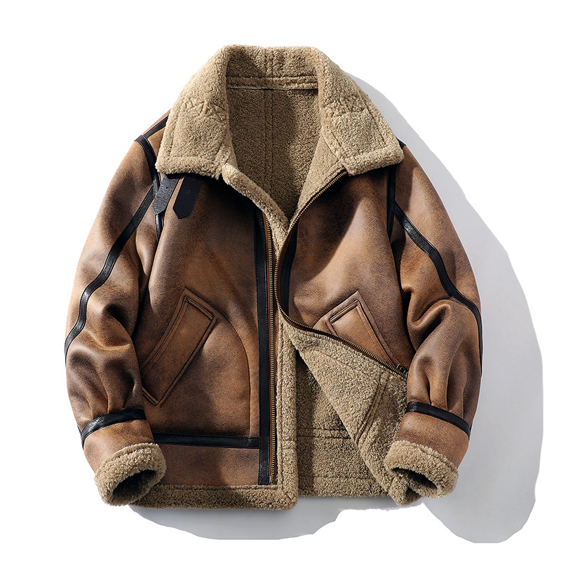 PY1526 크로스보더 무역 신상 남성용 대형 사이즈 에어포스 스타일 모피 일체형 플러스 벨벳 두꺼운 라펠 바이커 가죽 재킷