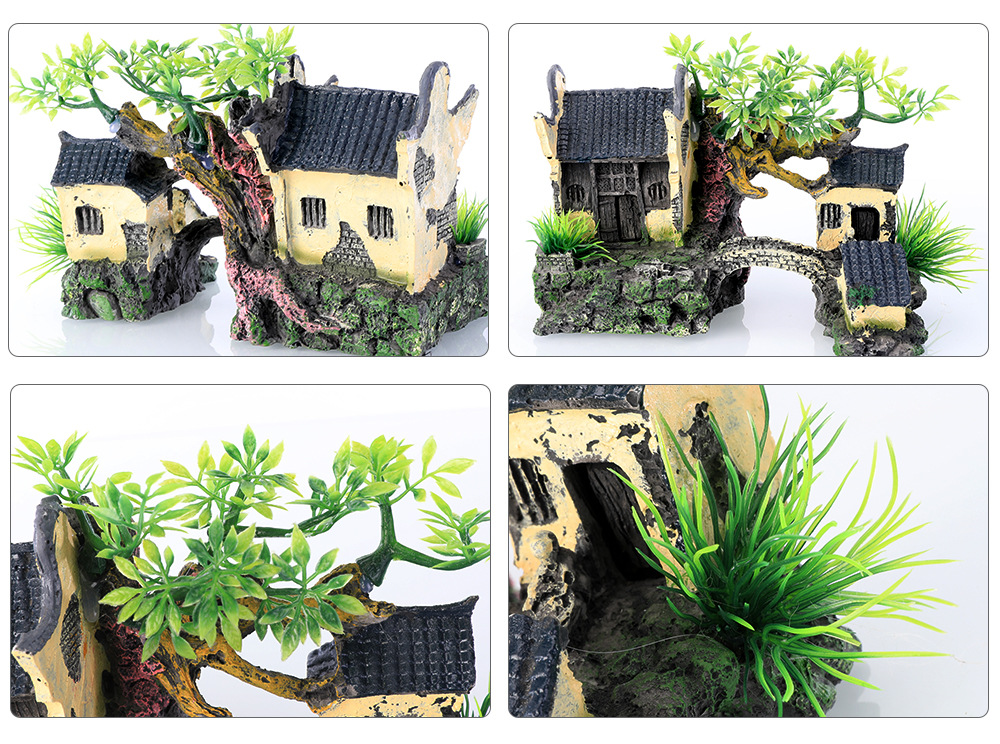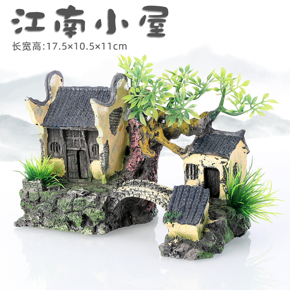 물고기 집 어항 가짜 산 수족관 장식 풍경 돌 작은 집 가짜 물 잔디 Jiangnan Watertown 창조적 인 장식품
