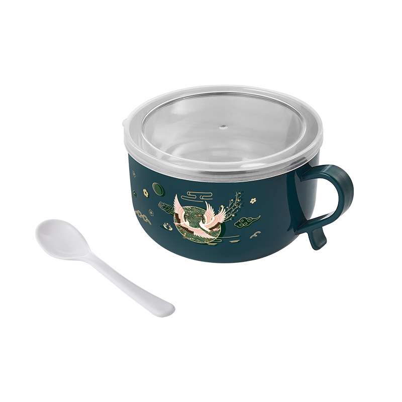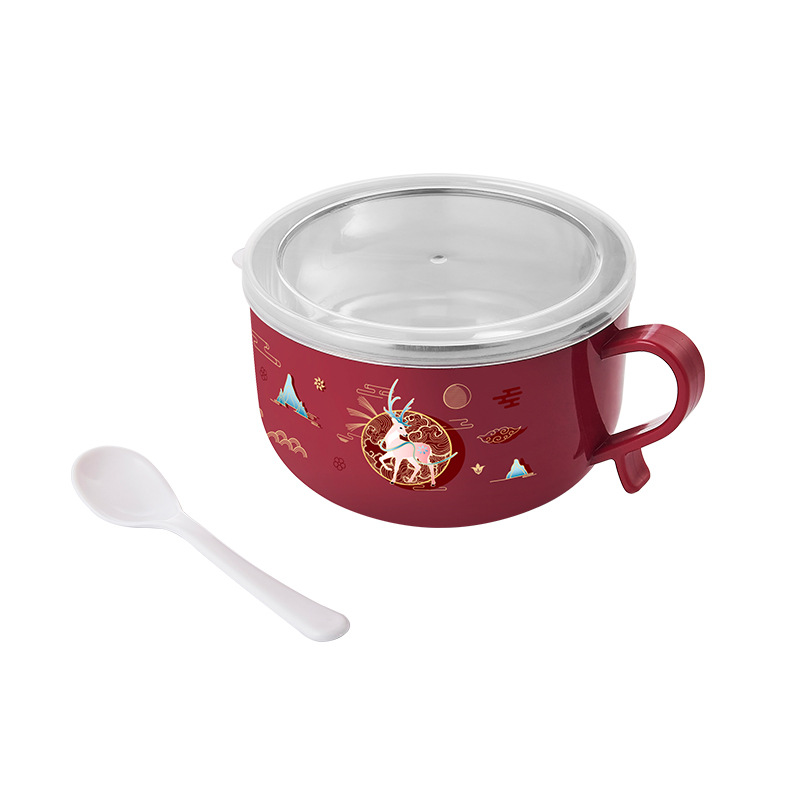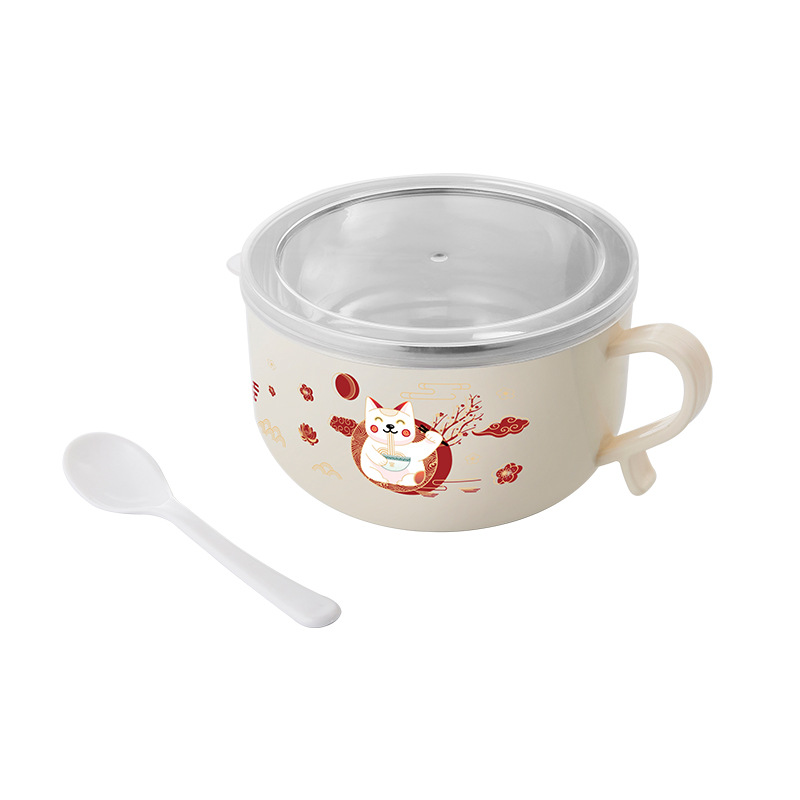 Guochao 인스턴트 국수 그릇 가정용 스테인레스 스틸 뚜껑 럭키 고양이 귀여운 학생 기숙사 직장인 사슴 단일 밥 그릇