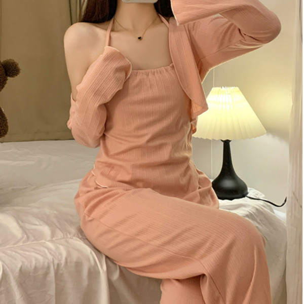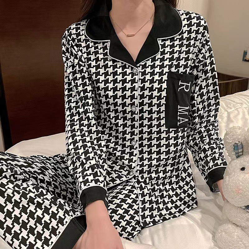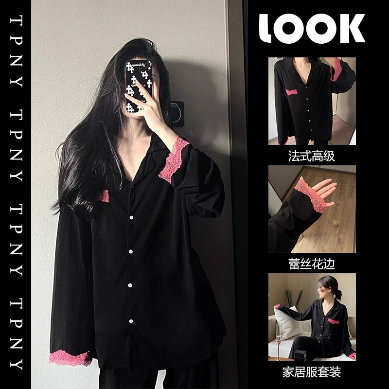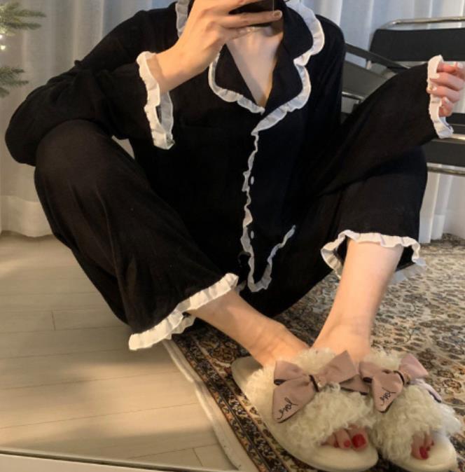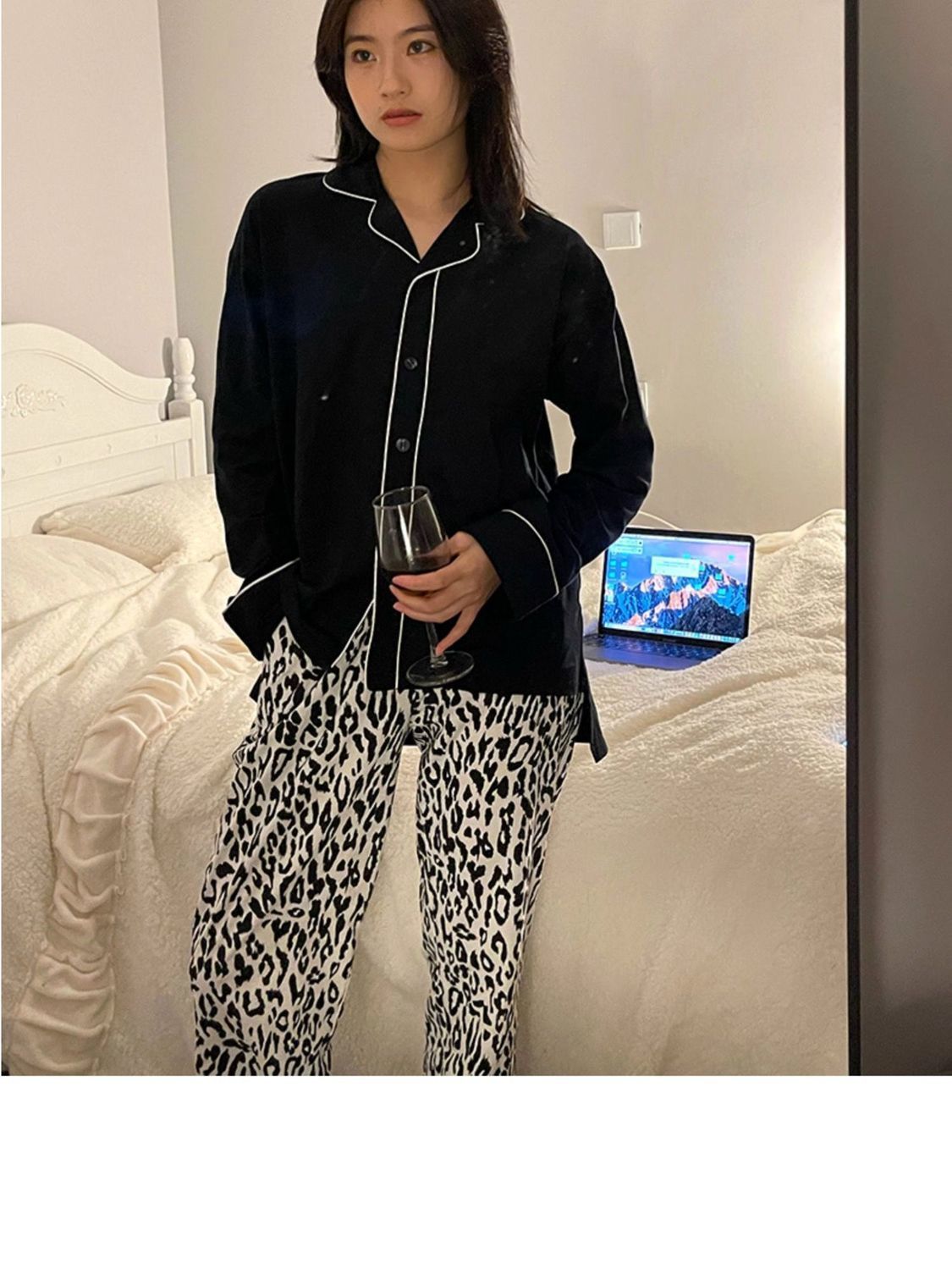 봄과 여름 한국 잠옷 여성 긴 소매 인터넷 인기 블랙 레오파드 카디건 가을과 겨울 홈 얇은 세트 2025