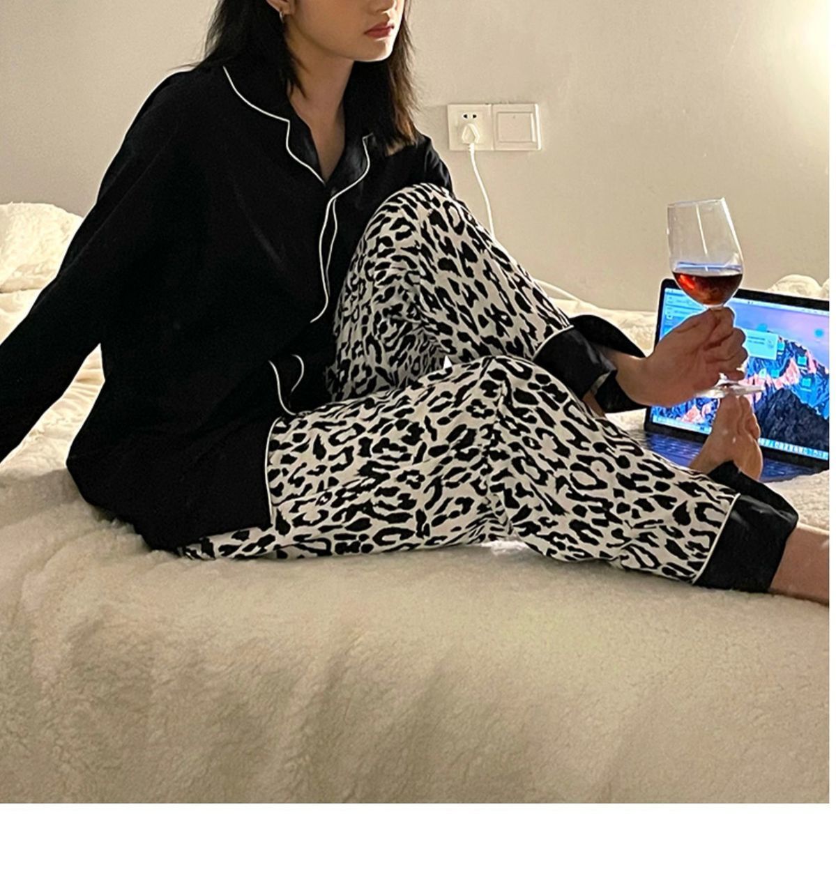 春秋季韩版睡衣女士长袖网红黑色豹纹开衫秋冬家居服薄款套装2021