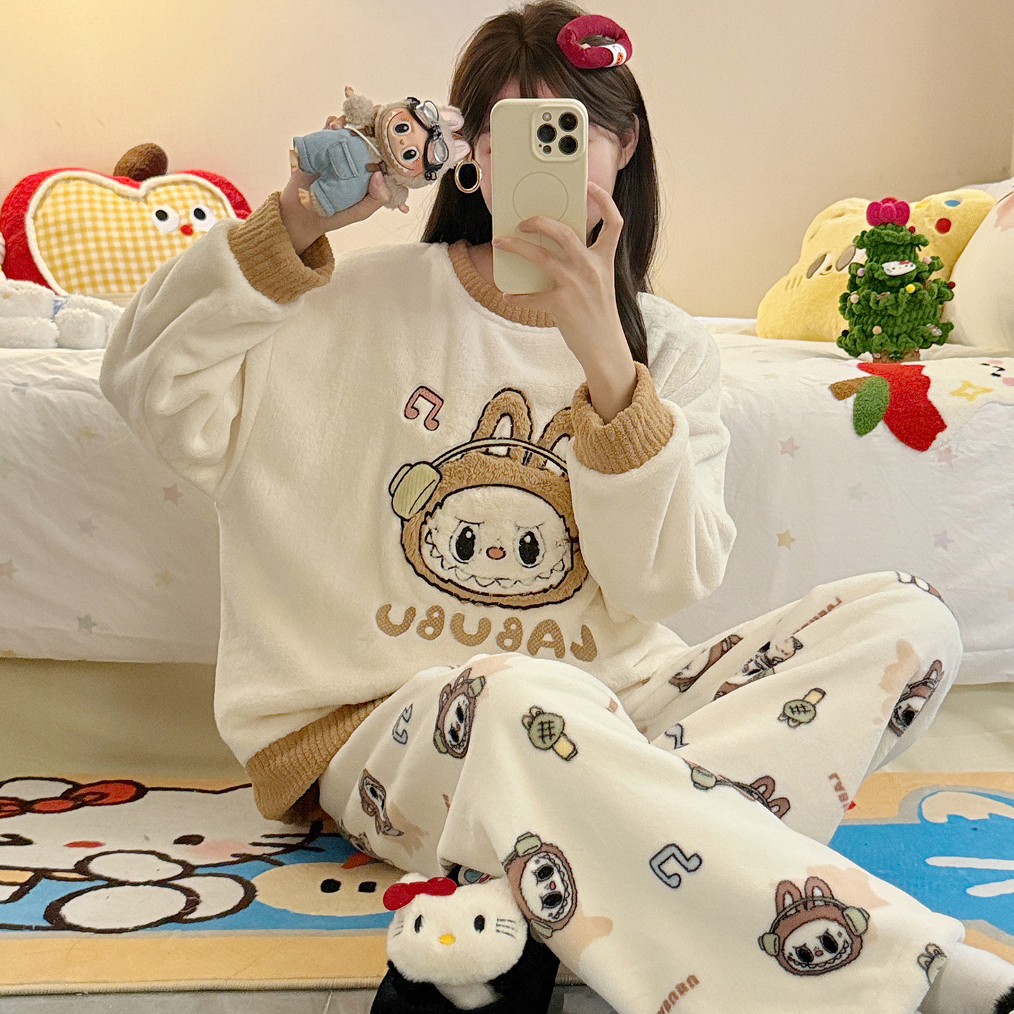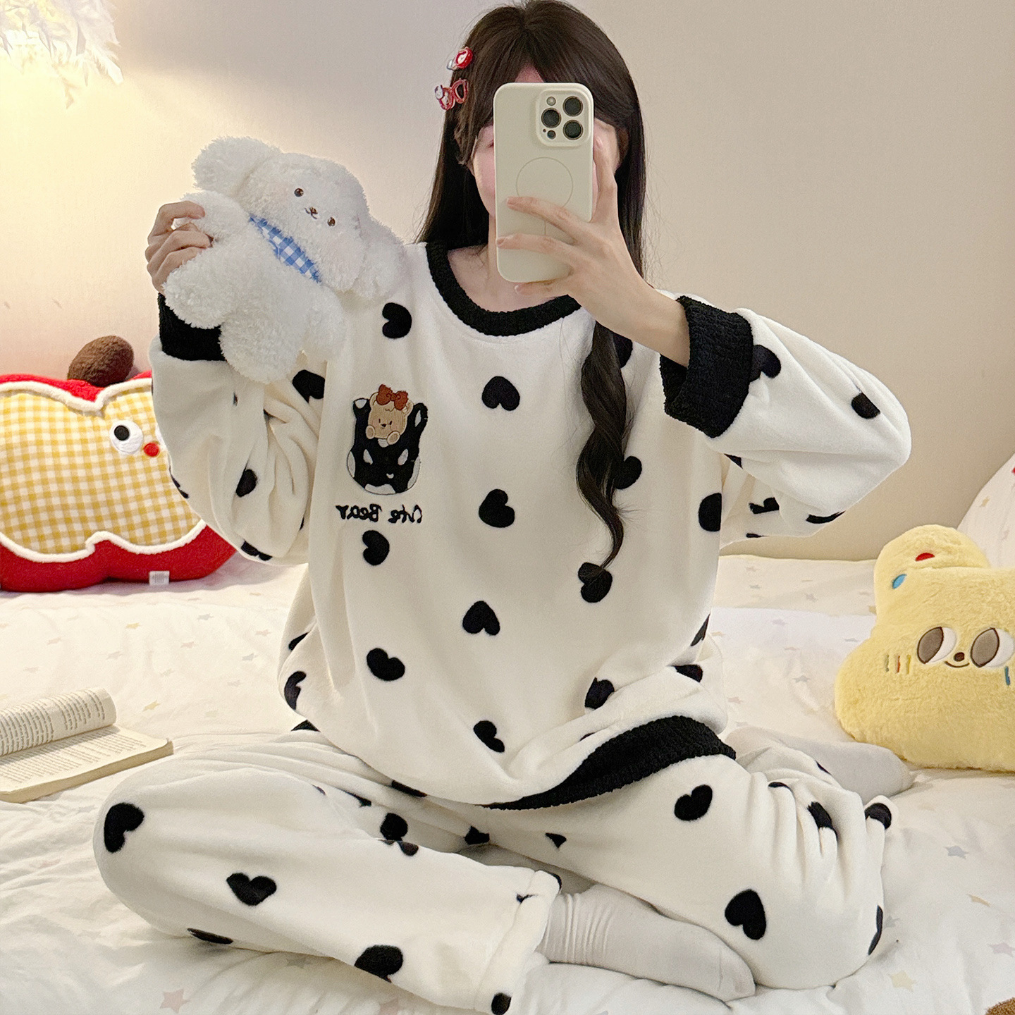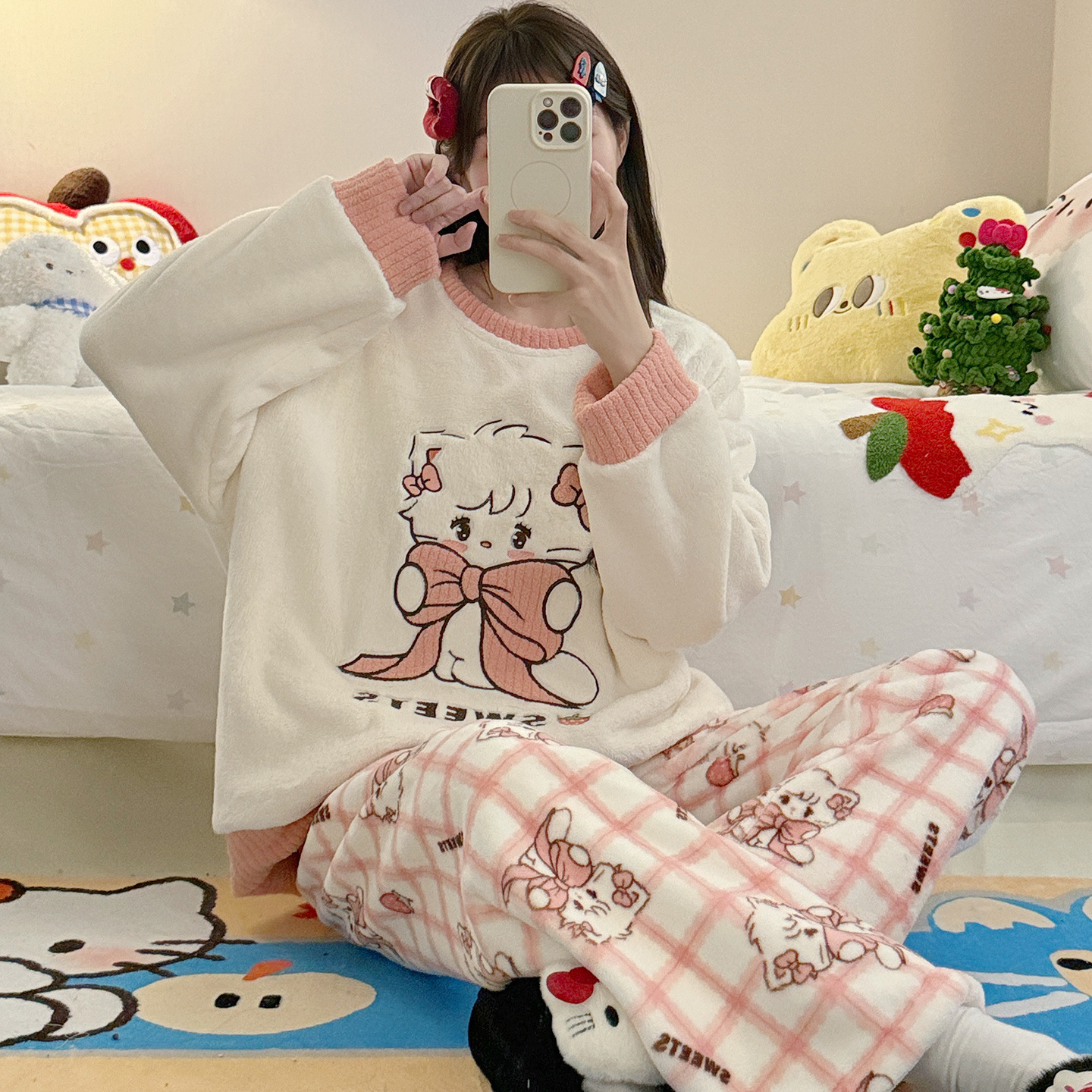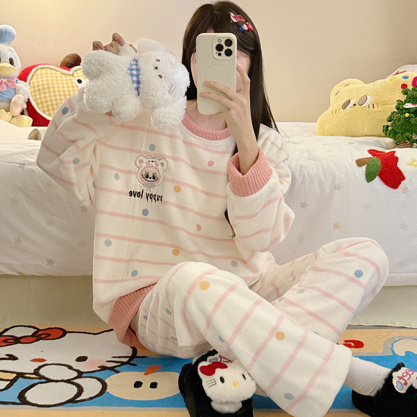 가을과 겨울 플란넬 잠옷 여성의 두꺼운 따뜻한 겨울 산호 양털 귀여운 만화 여성 잠옷 홈 세트