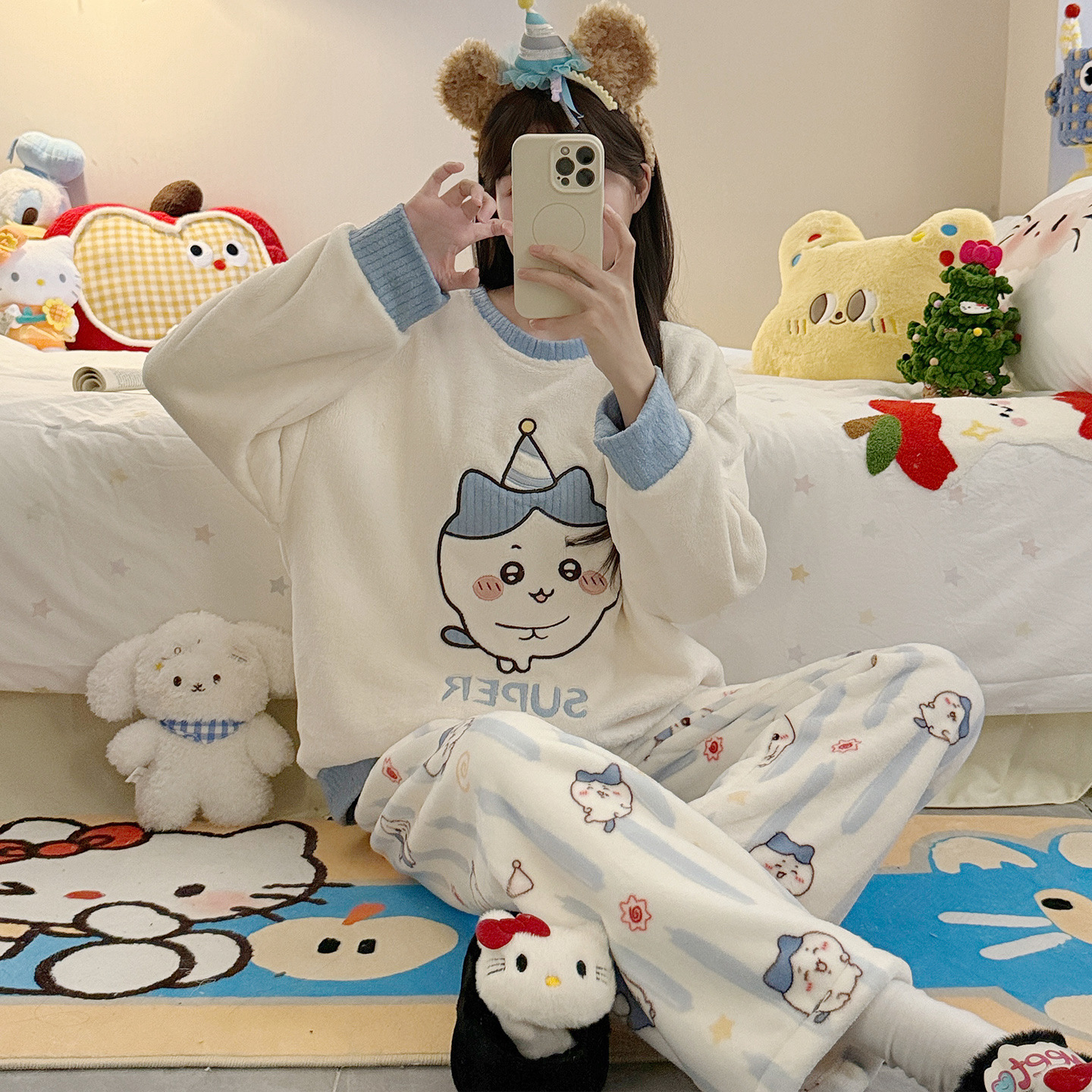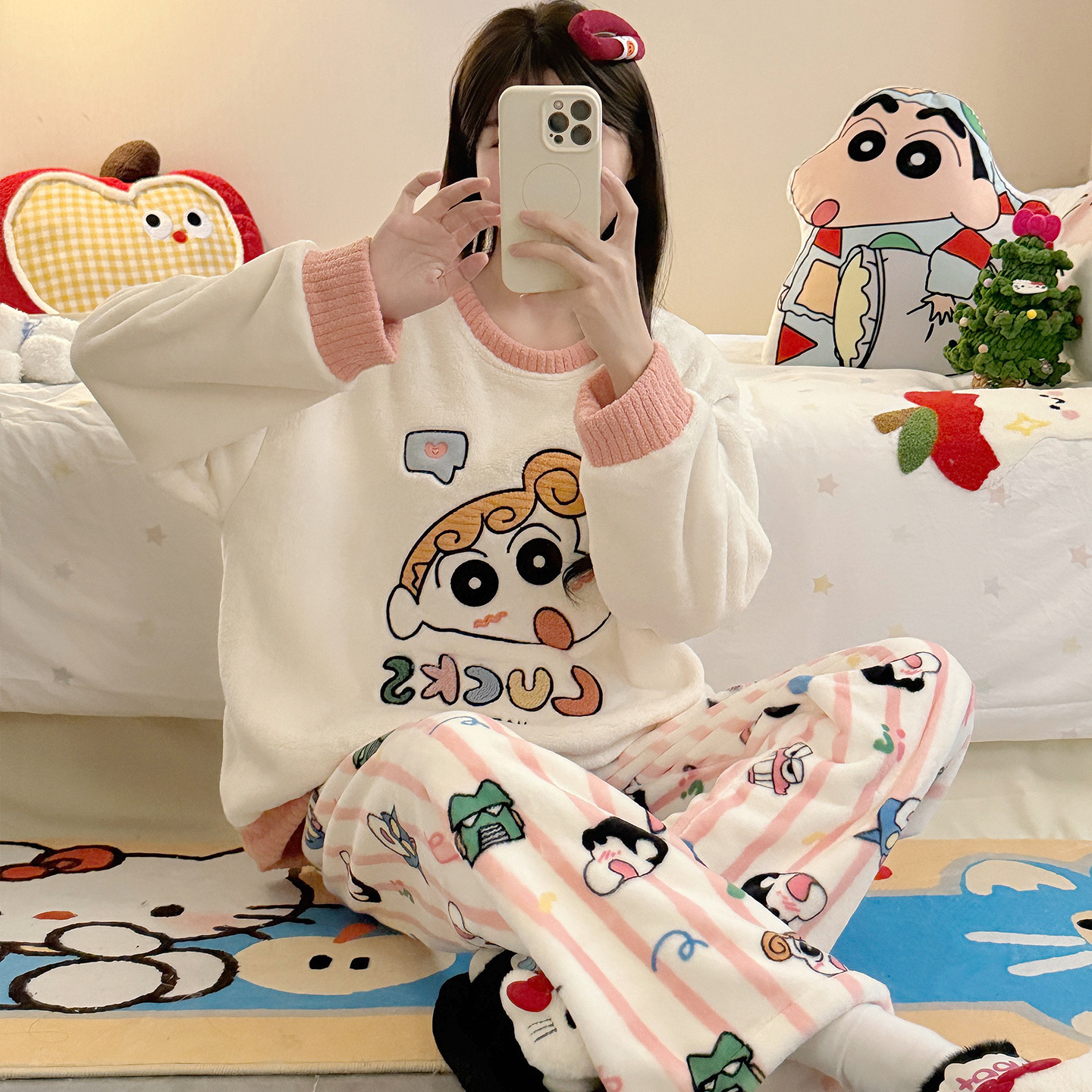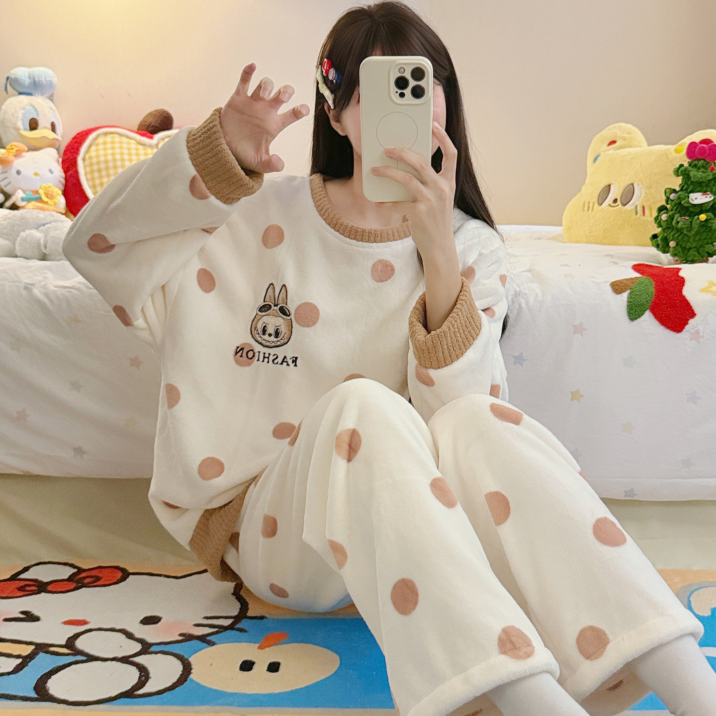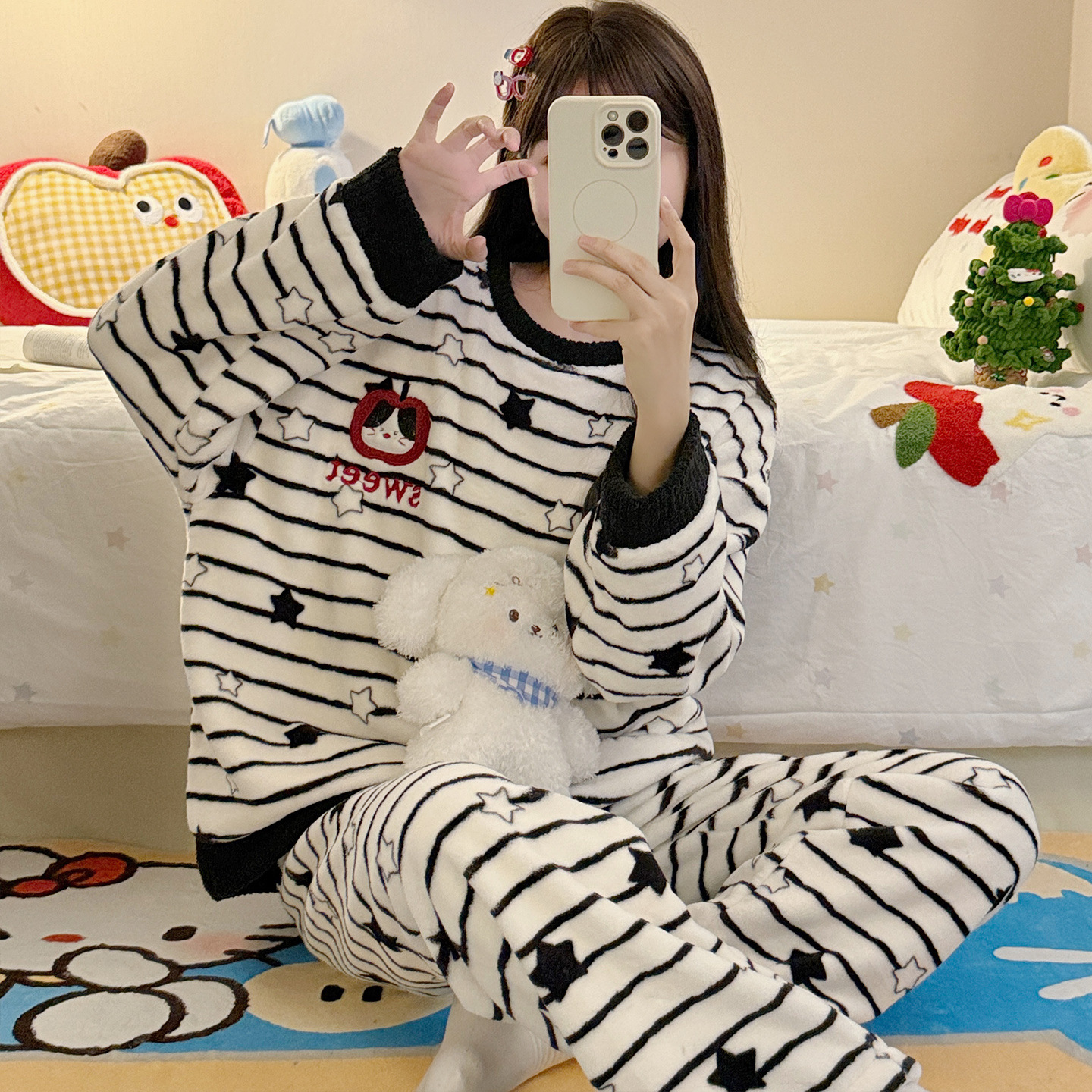 가을과 겨울 플란넬 잠옷 여성의 두꺼운 따뜻한 겨울 산호 양털 귀여운 만화 여성 잠옷 홈 세트