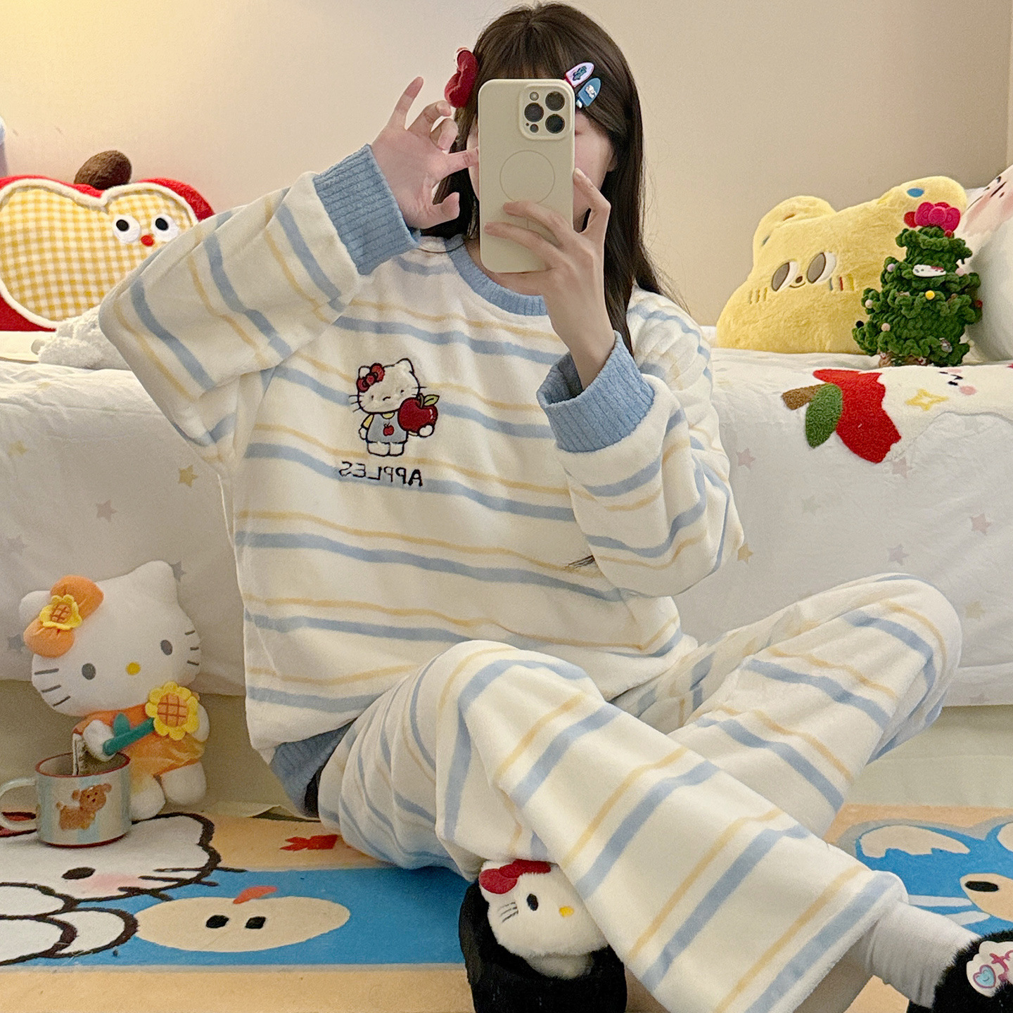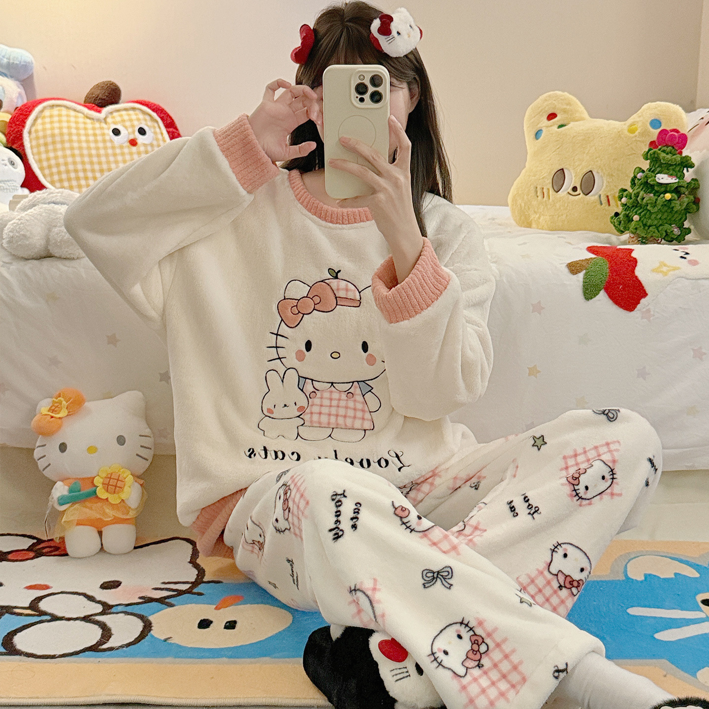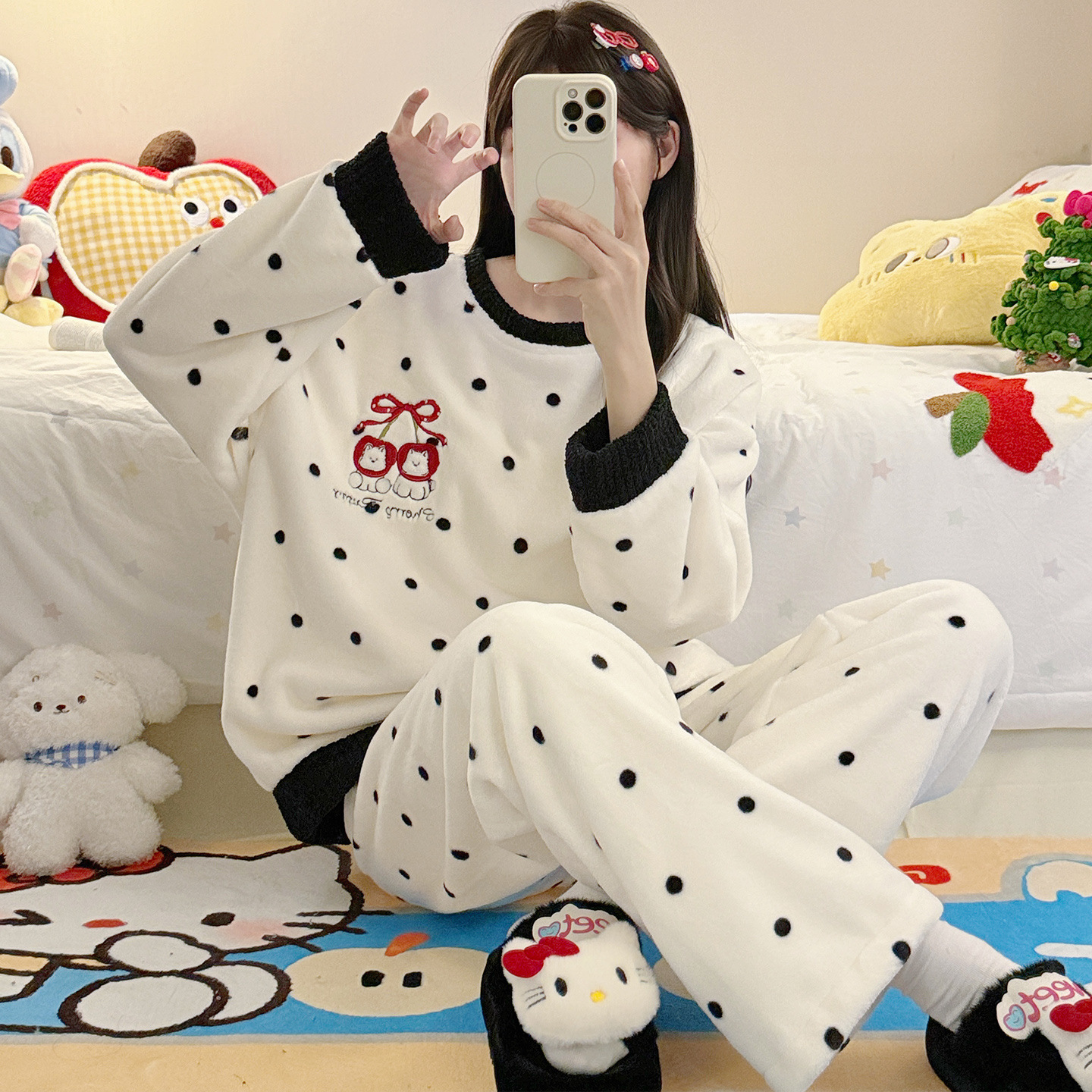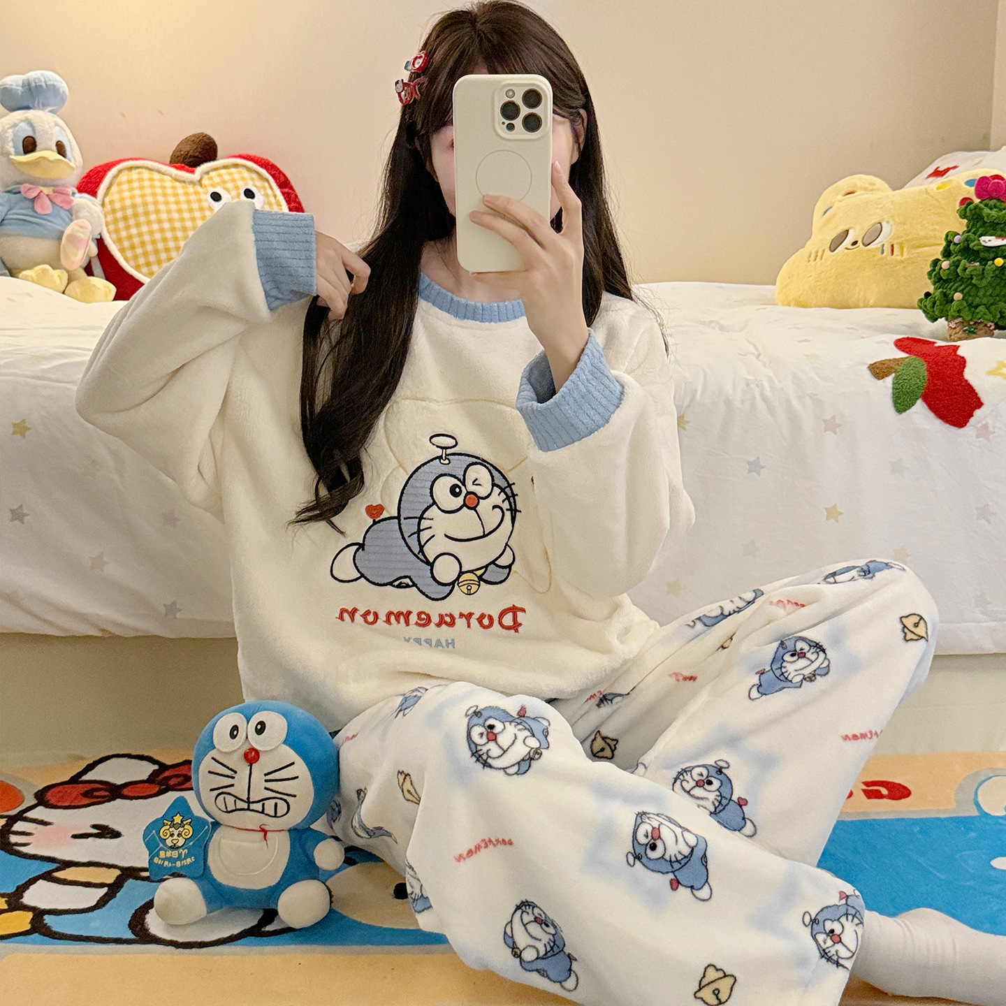 가을과 겨울 플란넬 잠옷 여성의 두꺼운 따뜻한 겨울 산호 양털 귀여운 만화 여성 잠옷 홈 세트