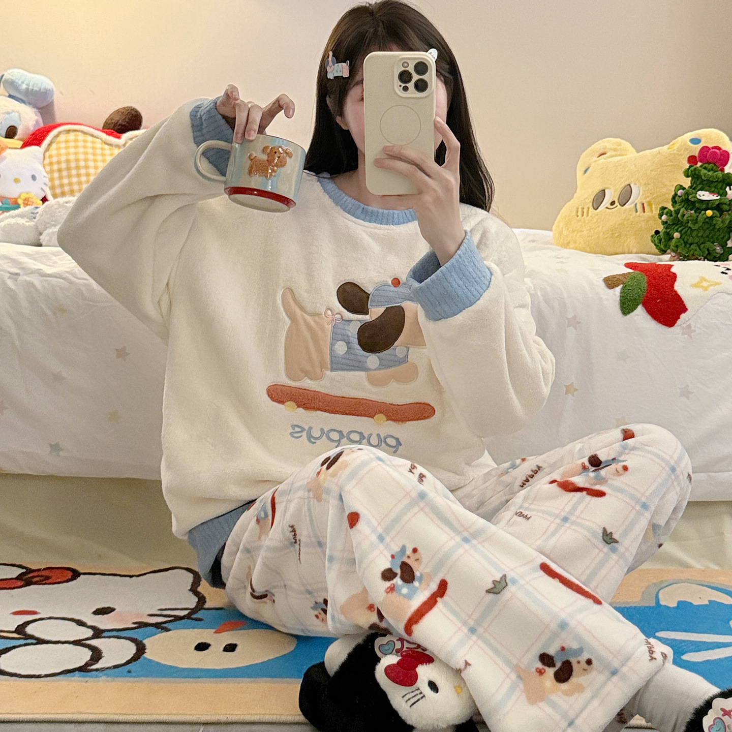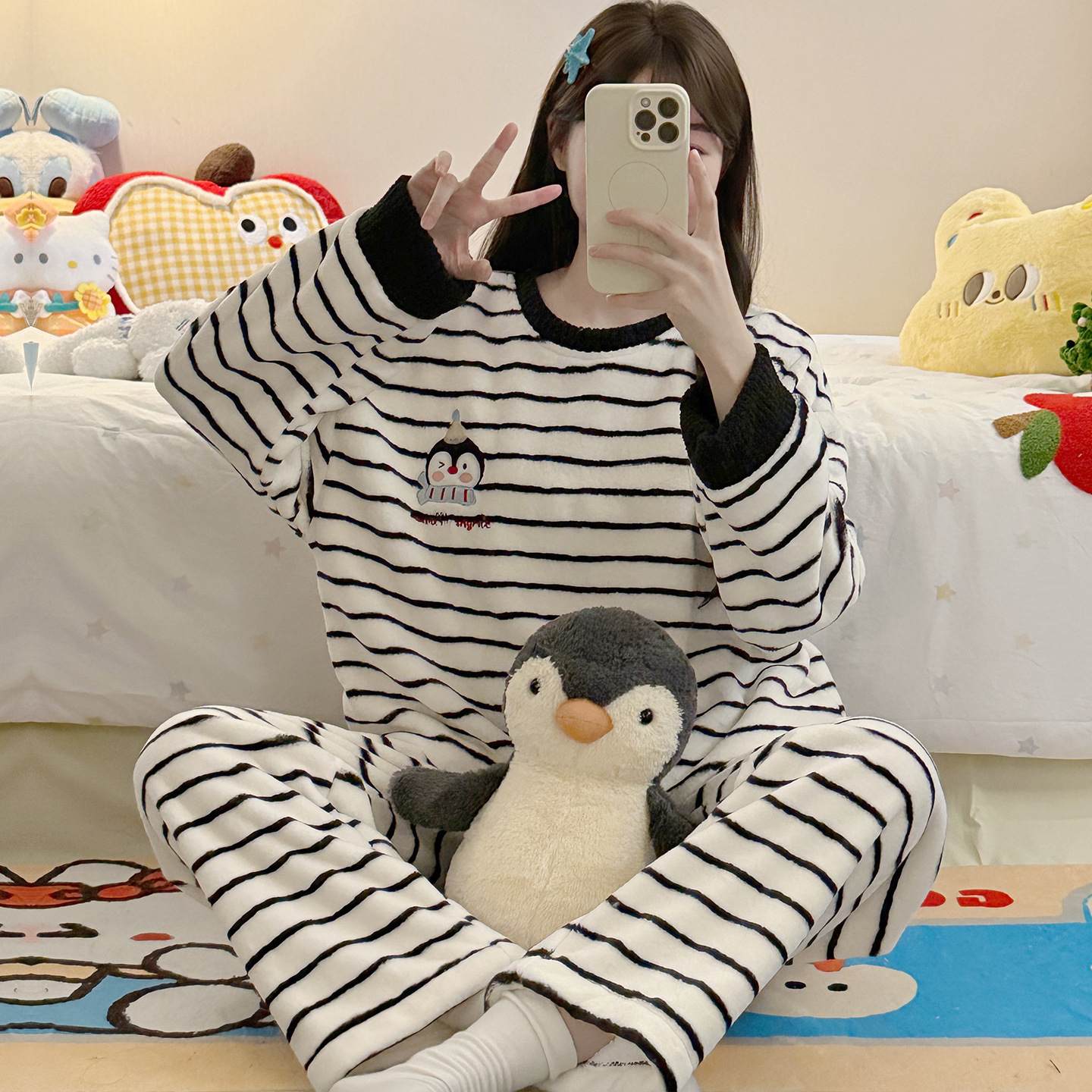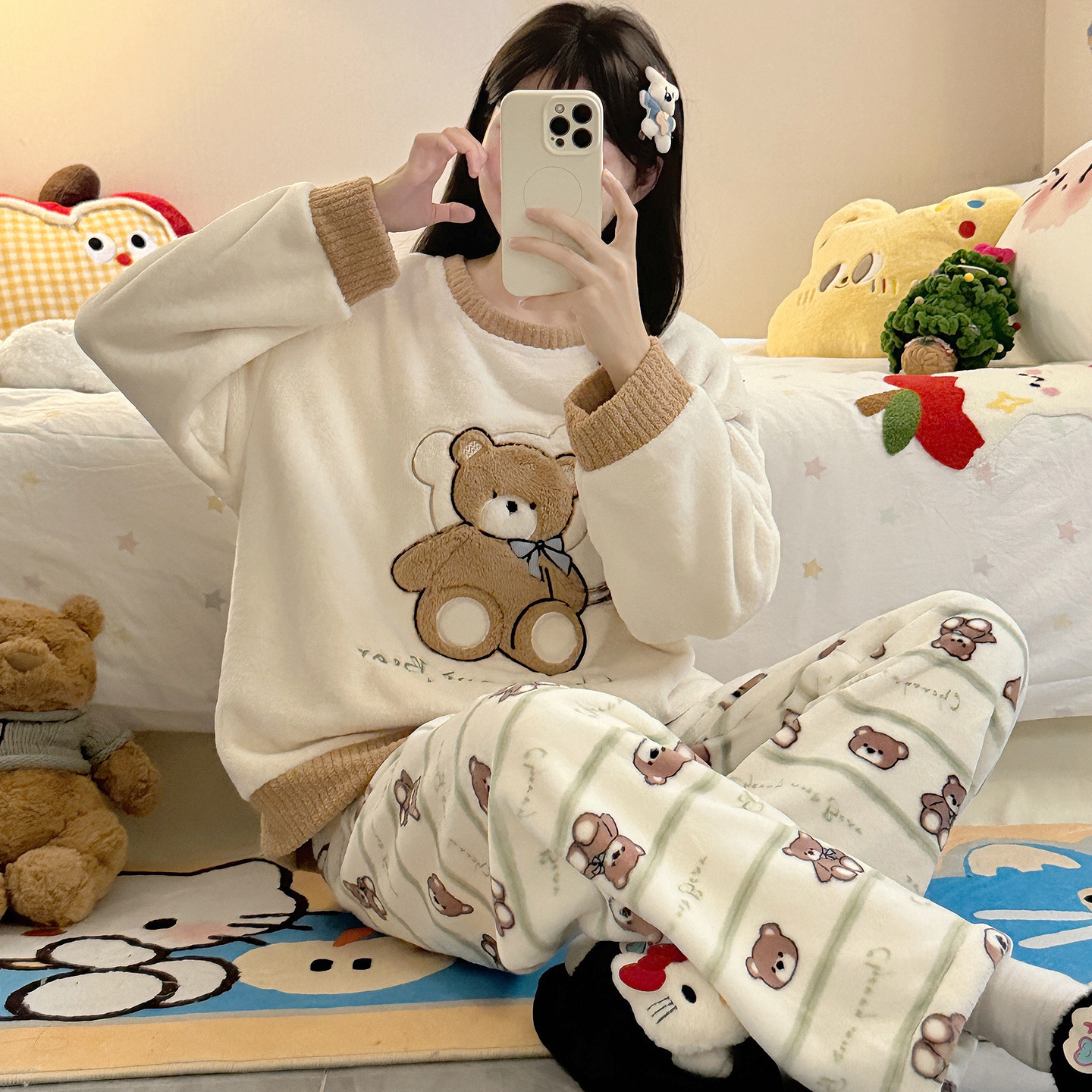 가을과 겨울 플란넬 잠옷 여성의 두꺼운 따뜻한 겨울 산호 양털 귀여운 만화 여성 잠옷 홈 세트스토어 가기