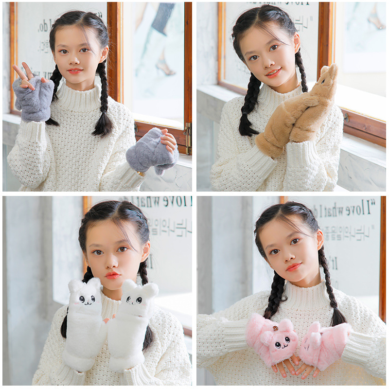 8-12 세 소년 소녀 어린이 가을과 겨울 시즌 플러시 귀여운 반 손가락 플립 학생 쓰기 따뜻한 장갑